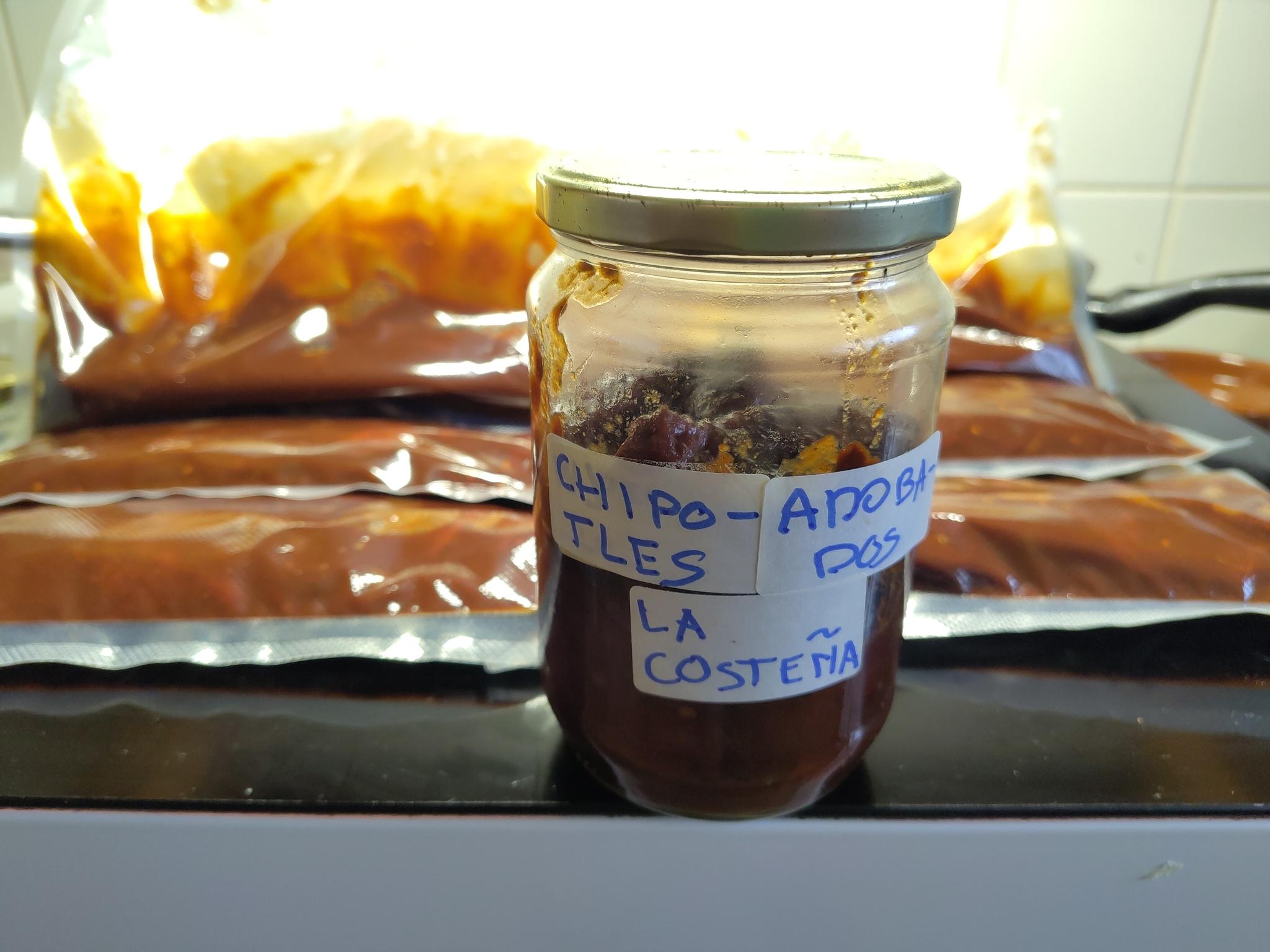 Nu heb ik 2,8 kilo chipotle in adobo saus aangeschaft en in porties van omstreeks 400 gram verdeeld, 1 in een pot in de koelkast en 6 zacht gevacumeerd on de vriezer. En ondertussen heb een paar pepers zo opgegeten. Ze zijn heerlijk, de saus iets pittiger dan de chipotle zelf, dus dat komt wel op.
