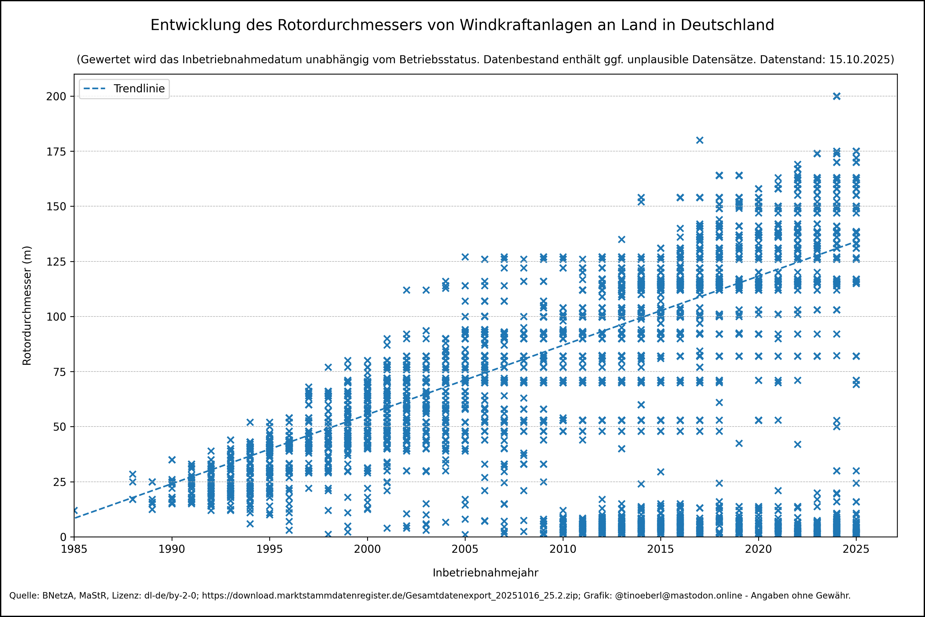 Entwicklung des Rotordurchmessers von #Windkraftanlagen an Land in #Deutschland mit Stand vom 15.10.2025.
