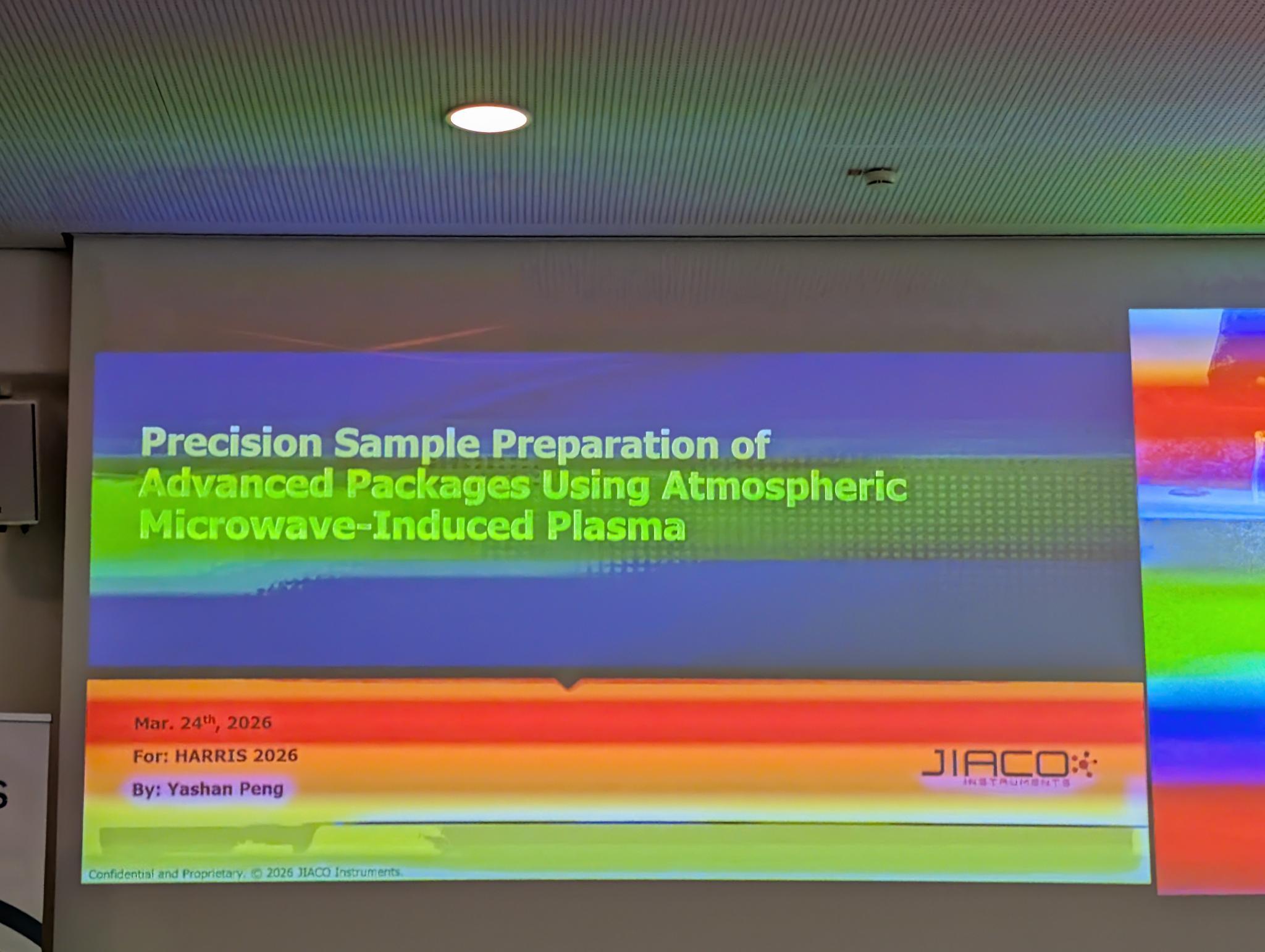 Projector screen showing a title slide for a talk titled "precision sample preparation of advanced packages using atmospheric microwave induced plasma"