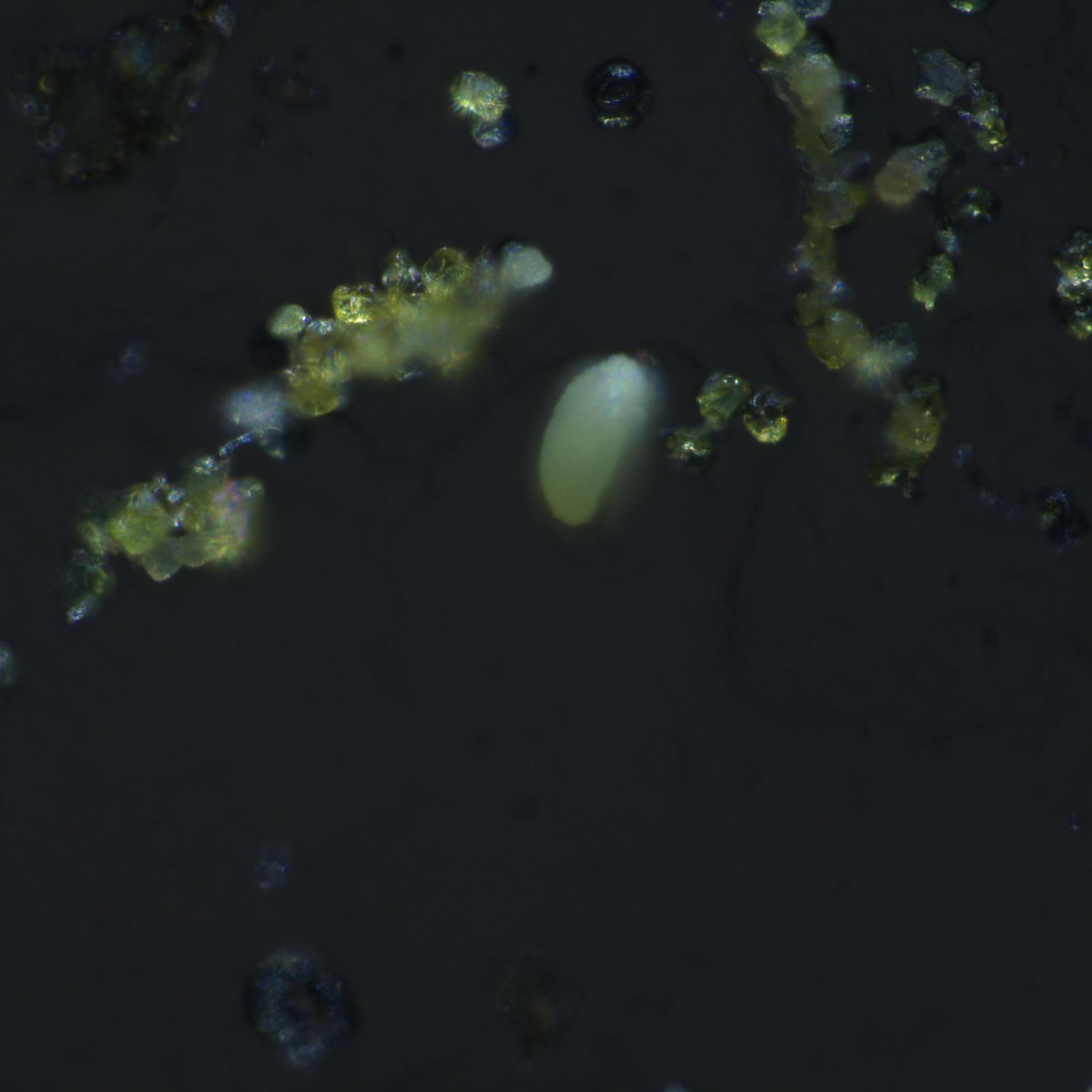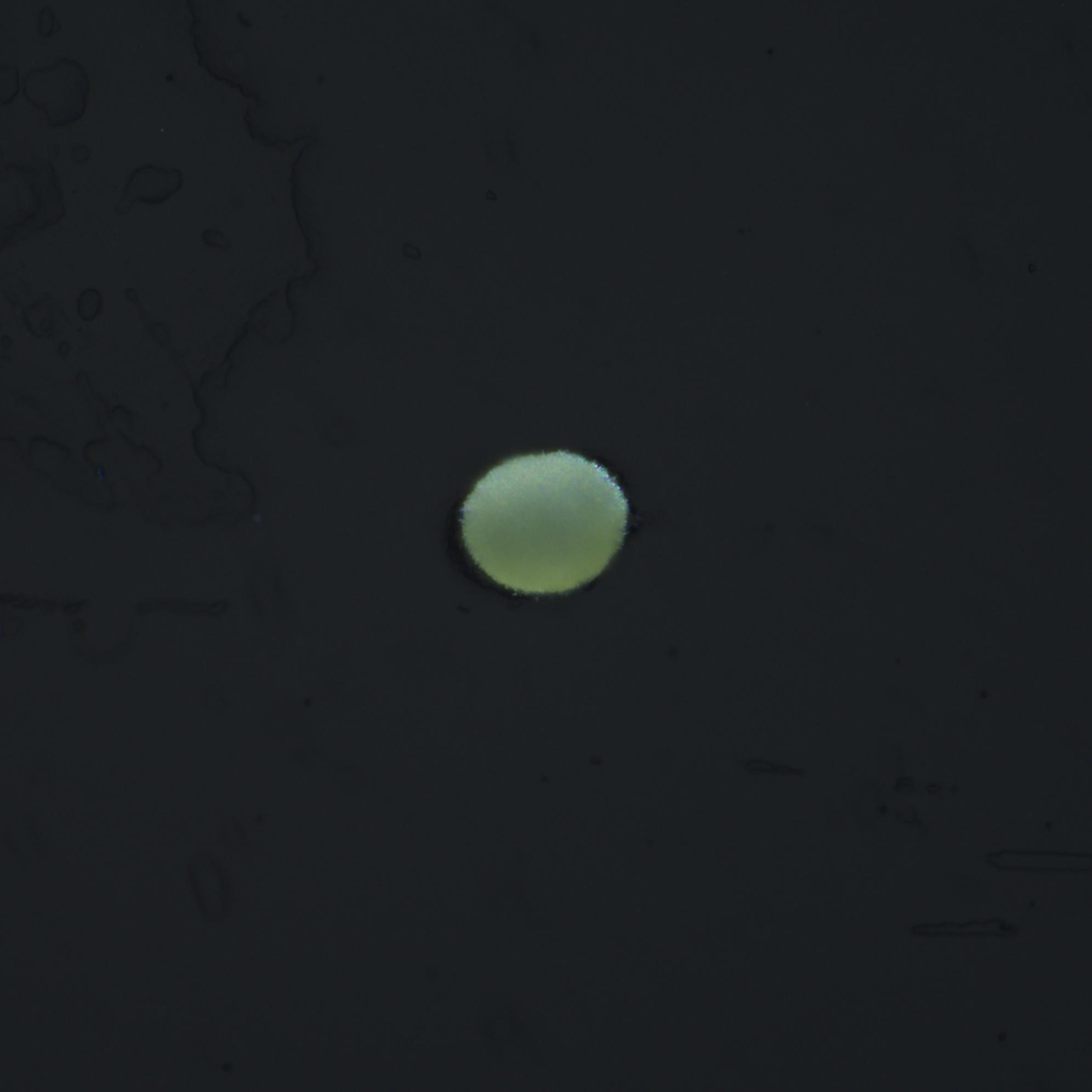 Spherical-ish pale green particle with a slightly fuzzy looking texture visible around the perimeter