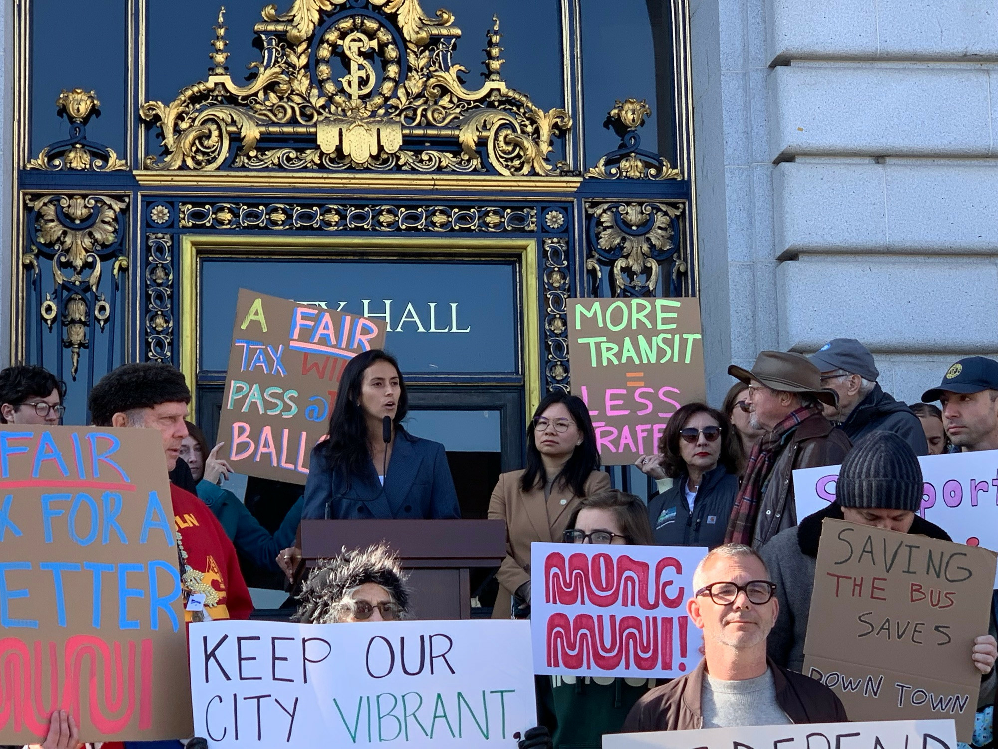 At the #muniForever rally, D9 supervisor Jackie Fielder calls on Mayor Lurie to raise the parcel tax cap for skyscrapers from $400k to $800k to raise more Muni funding, and eliminate tenant passthroughs. “As Muni goes, so goes the city.” Says if we don’t see movement in negotiations, we’ll be back with more to announce. 1/3