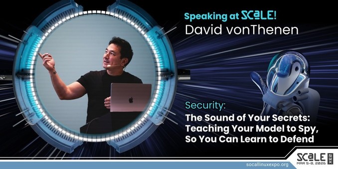 David vonThenen will speak on 'The Sound of Your Secrets: Teaching Your Model to Spy, So You Can Learn to Defend' as part of our Security track at SCaLE 23x. Full details: https://www.socallinuxexpo.org/scale/23x