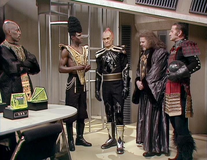 BELKOV: Oh, I must greet our opponents, Gambit. I'm glad to see they're punctual at least. [Servalan and her guards enter] Oh, we're honoured by your visit, Commissioner Sleer.