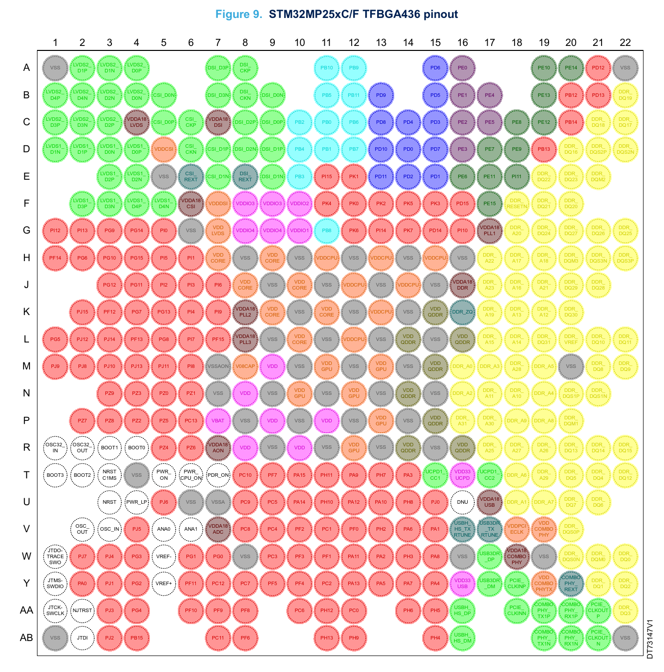 Here's the STM32MP257 TFBGA436 package with balls color coded (somewhat roughly) by power domain/function. I grouped some similar rails together e.g. all low voltage digital core balls are the same color (orange) even though there's multiple 0.8 / 0.82 / 0.9V domains there. All IO power (except dedicated PHY rails) is magenta regardless of which bank(s) it's for.