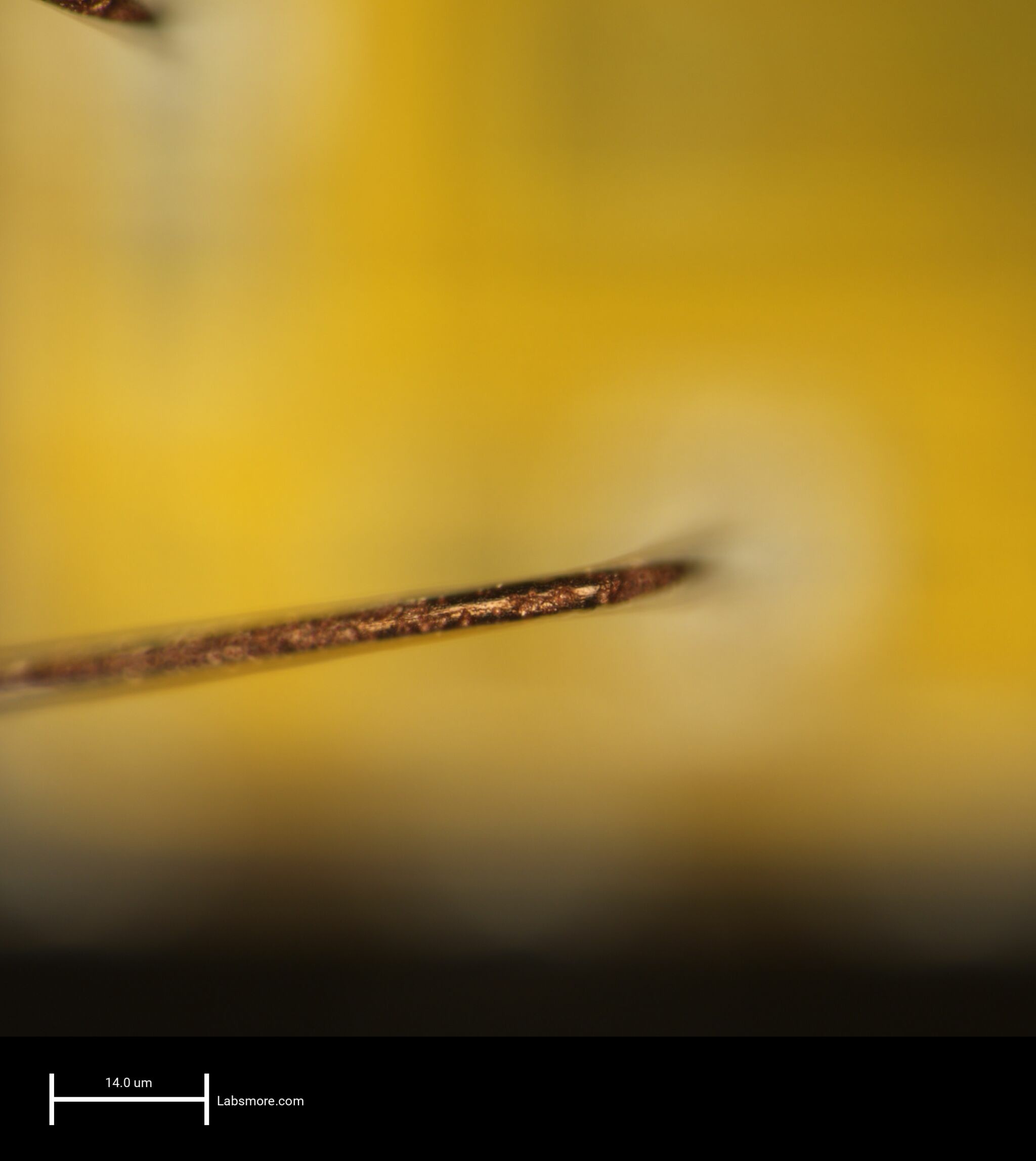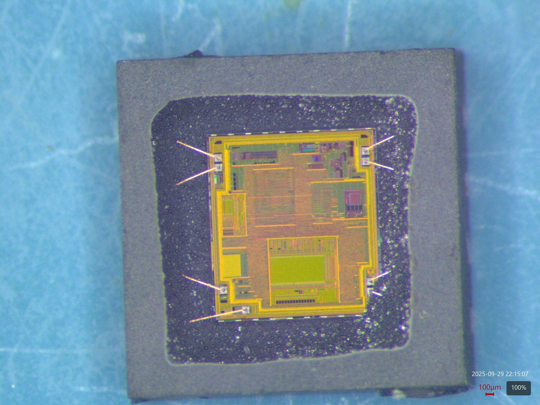 You can clearly see the imprint where the bond wire (etched off during decap) squished into the pad and squeezed the aluminum out around the perimeter. The middle area either got thinned down mechanically during the bonding process, or form…