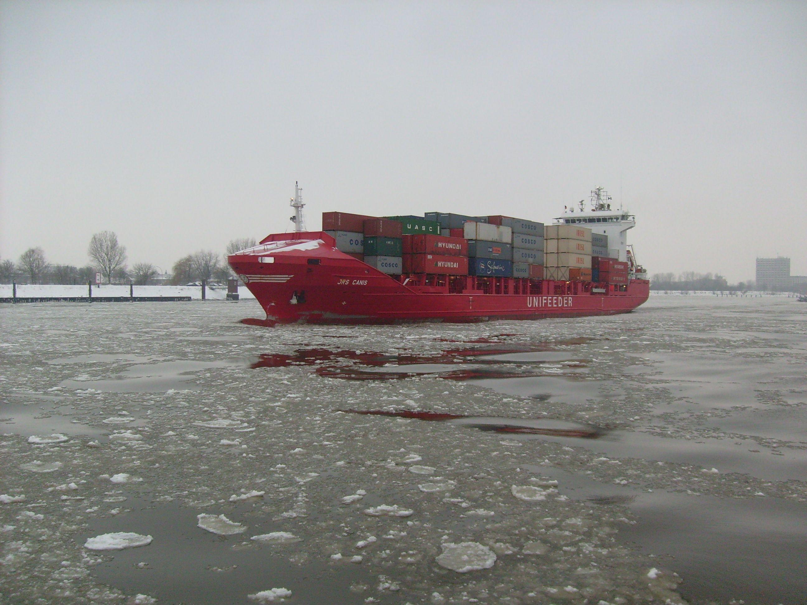 Mein Foto zeigt einen Feeder bei Eisgang auf der Unterelbe. Ein "kleiner" Containerschiffs-Typ der als Zubringer für die gigantischen Übersee-Containerschiffe dient. …