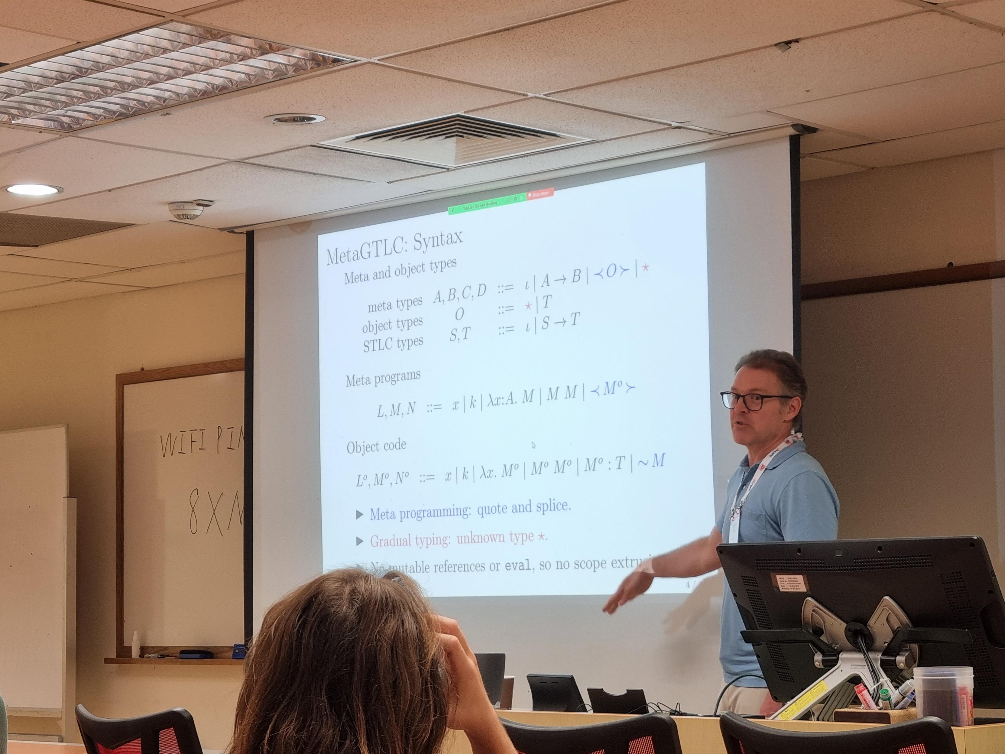 Jeremy Siek presenting "Gradual Metaprogramming" with proofs in Agda.