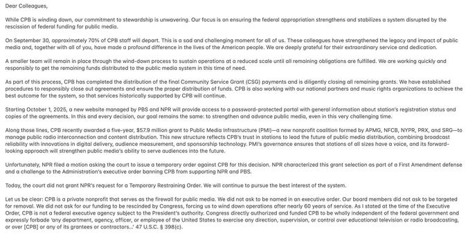 Memo: CPB says the court did not grant NPR's request for a restraining order blocking CPB from awarding $57.9M in satellite funds to a public media consortium (Ben Mullin/@benmullin)
