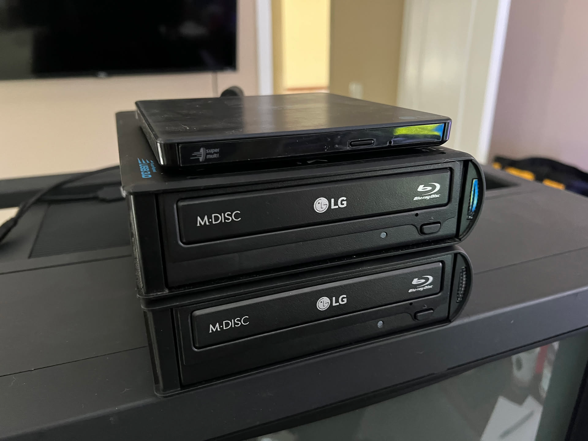 The portable drive on top is an LG WP50NB40 which has also been upgraded via firmware to an LG BP50NB40 for some extra capabilities. Also annoying things like Riplock have been dis…