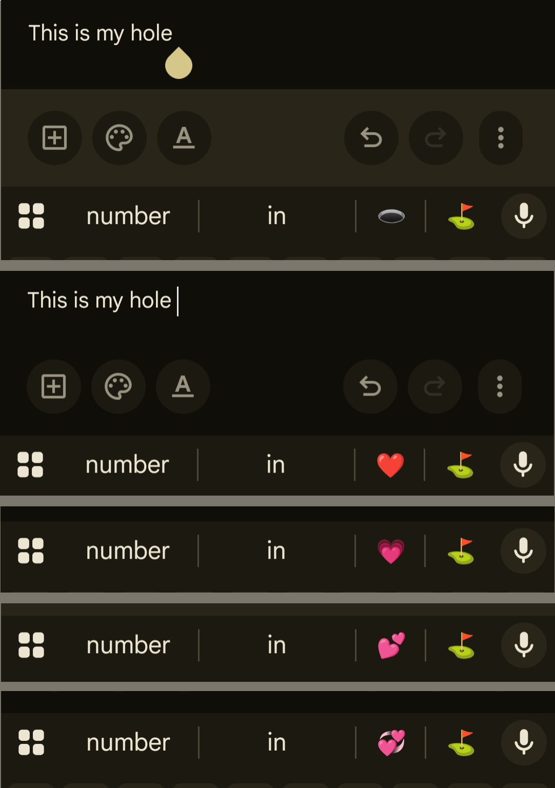 A composite of several screenshots. The first one shows the text "This is my hole" with keyboard auto-complete suggestions beneath. The text suggestions are "number" and "in". The emoji suggestions are the hole emoji and the golf emoji.