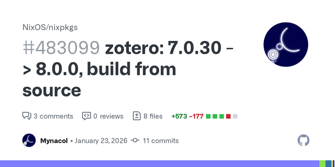 Such an amazing effort by @… to compile #Zotero from source in :nixos: nixpkgs. This will make it possible to easily try out Zotero patches or even make your own version with custom changes. Power of Nix! 💪