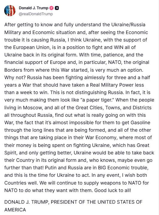 “Ook wil hij dat de NAVO-landen als blok importheffingen van 50 tot 100 procent instellen op producten uit China. Als ze dat niet doen, zal hij geen zware sancties opleggen aan Rusland, schrijft Trump in een bericht op zijn eigen platform Truth Social.”