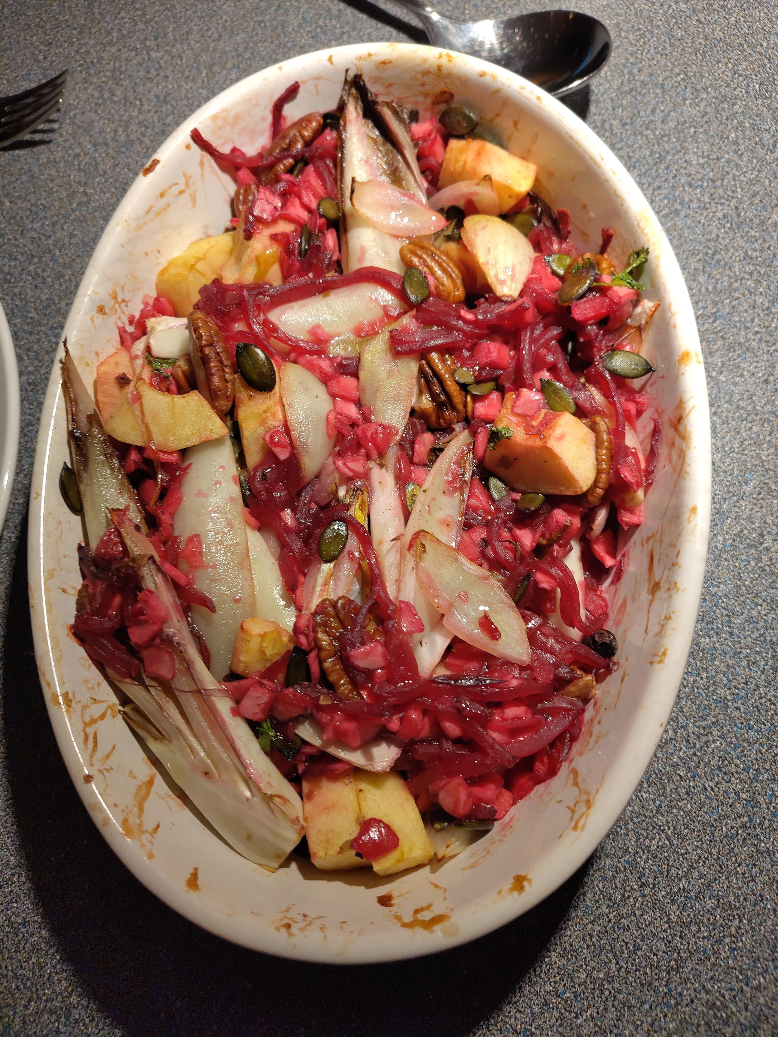 Bietjes, roodloof, appel, ui, pecannoten, pompoenpitten, zout, peper, olijfolie.