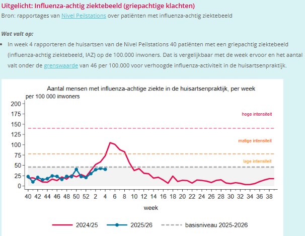 Met opnieuw de 'griepachtige klachten' onder de epidemische grens, zelfs nog wat lager dan vorige week toen het er heel dicht tegenaan zat.