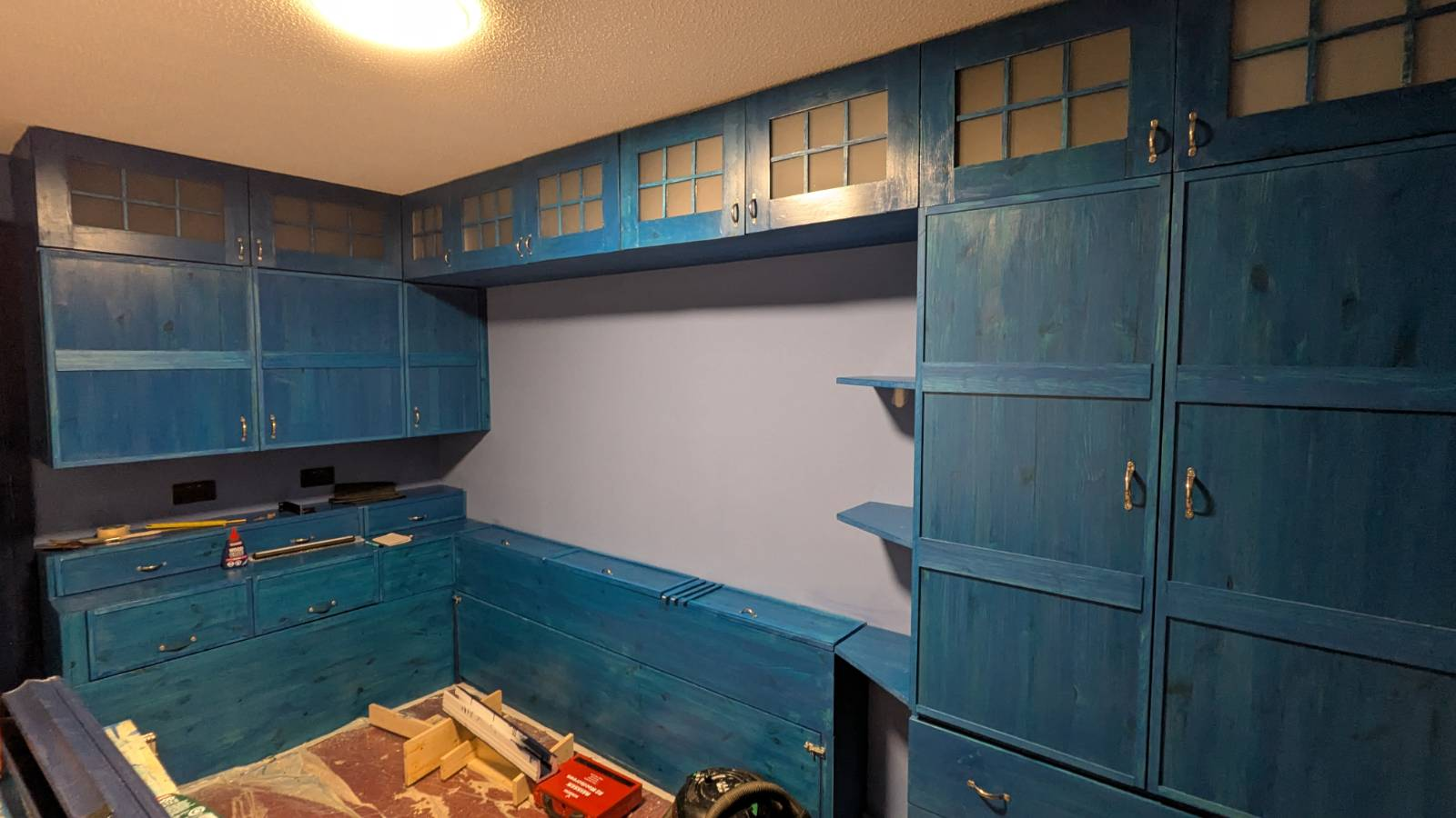 More of the edging, most of the handles, many of the holes I asked for are there so cables can get where they need to. They've been painting a bit and varnishing a bit and the coving is prepared for the gap above the windows there.