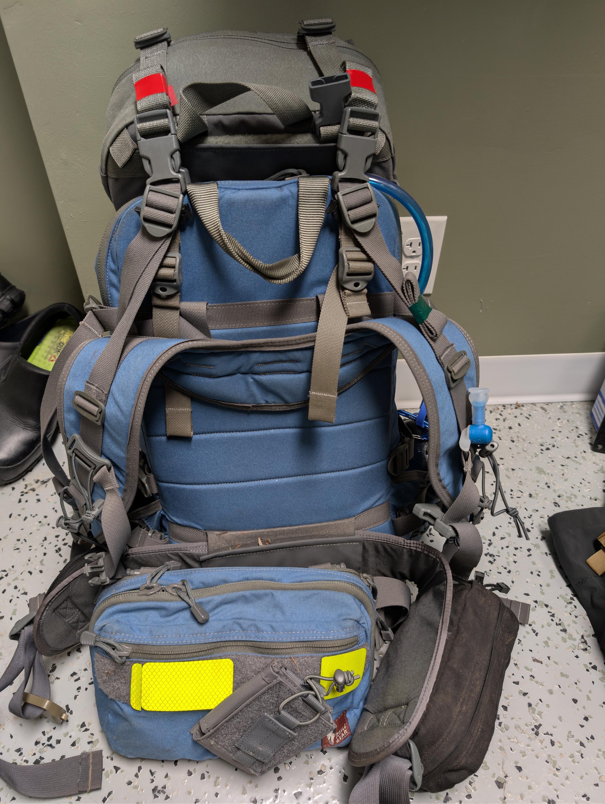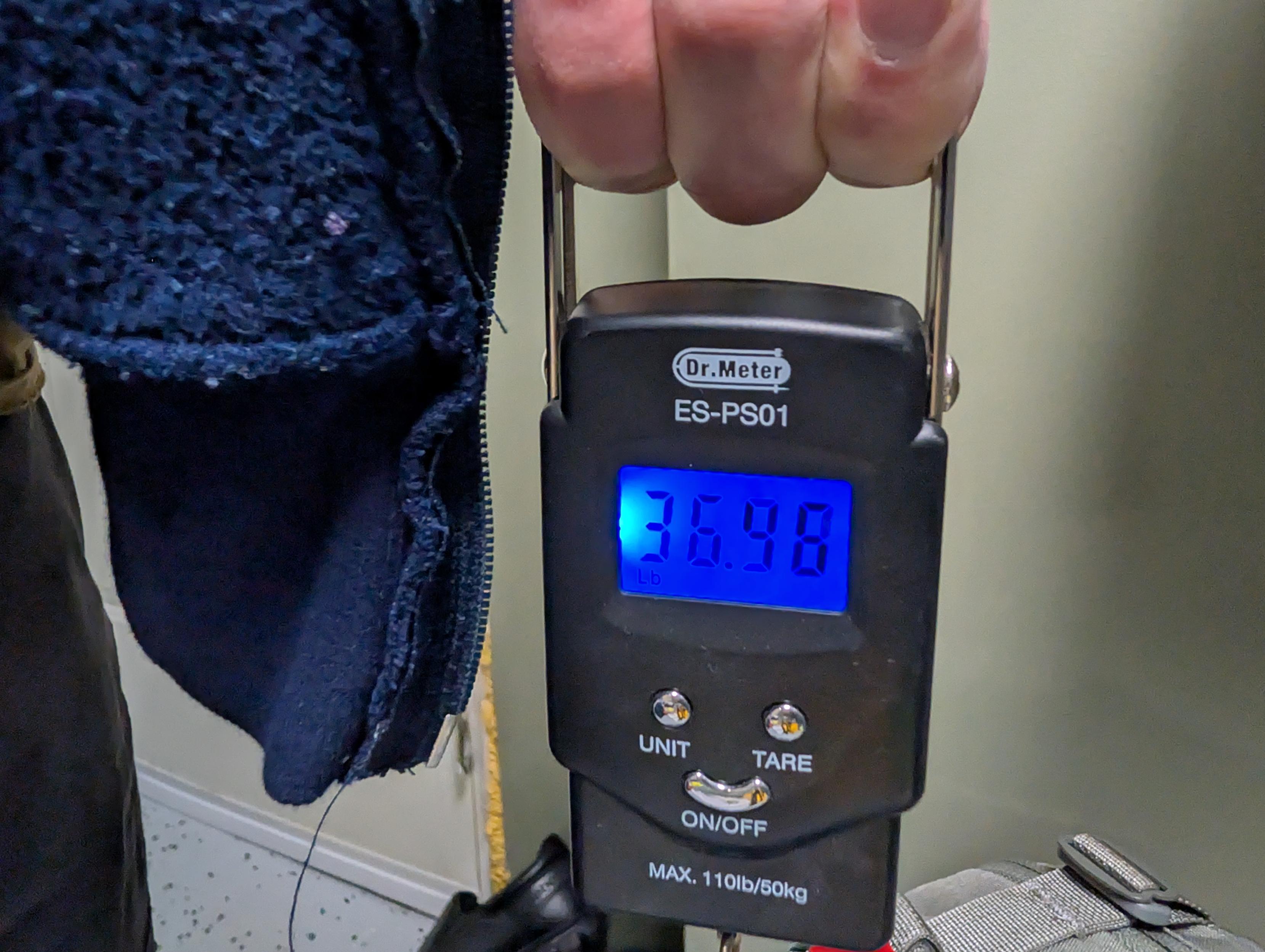 Pack weighs about 36.5 pounds or 16.5 kg including all of my food and water for the weekend but not the chest rig or any of the clothes I'll be wearing when I walk out the door. There's probably room to cut some weight still, i have some ideas that didn't quite make the cut for this round.
