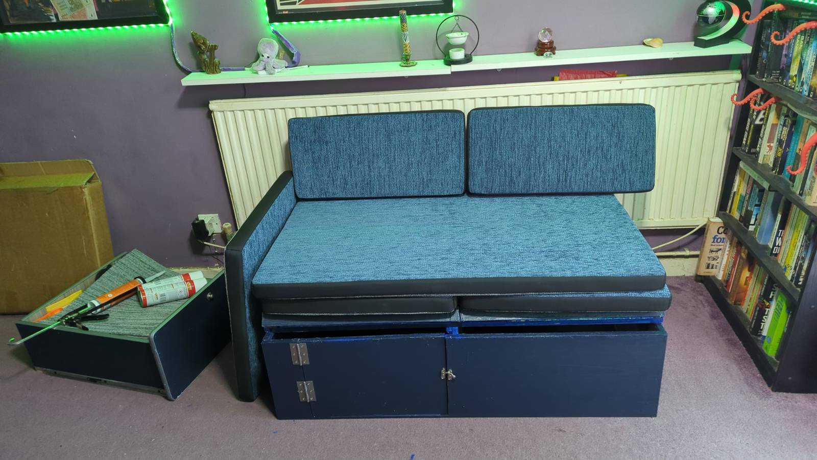 Even had time to start on the covering of the wood and insulation with the vinyl blue wood-effect wallpaper.