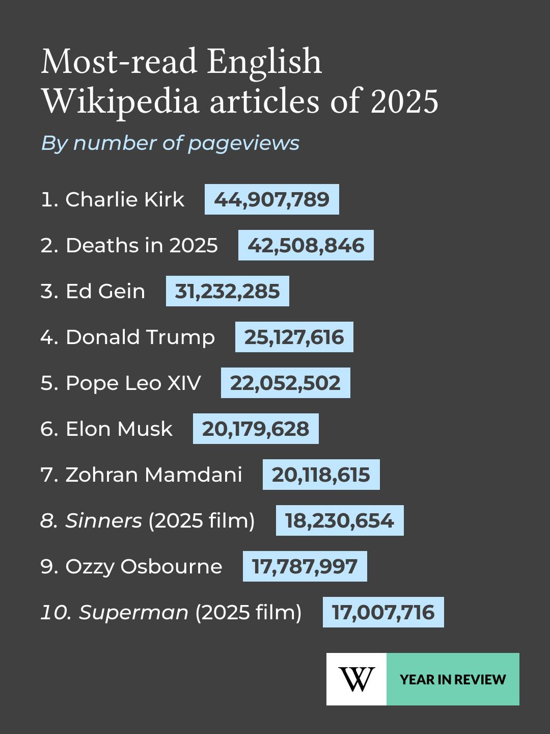 No surprise: the top ten most-viewed articles on the English @… in 2025 are basically politics and pop culture.