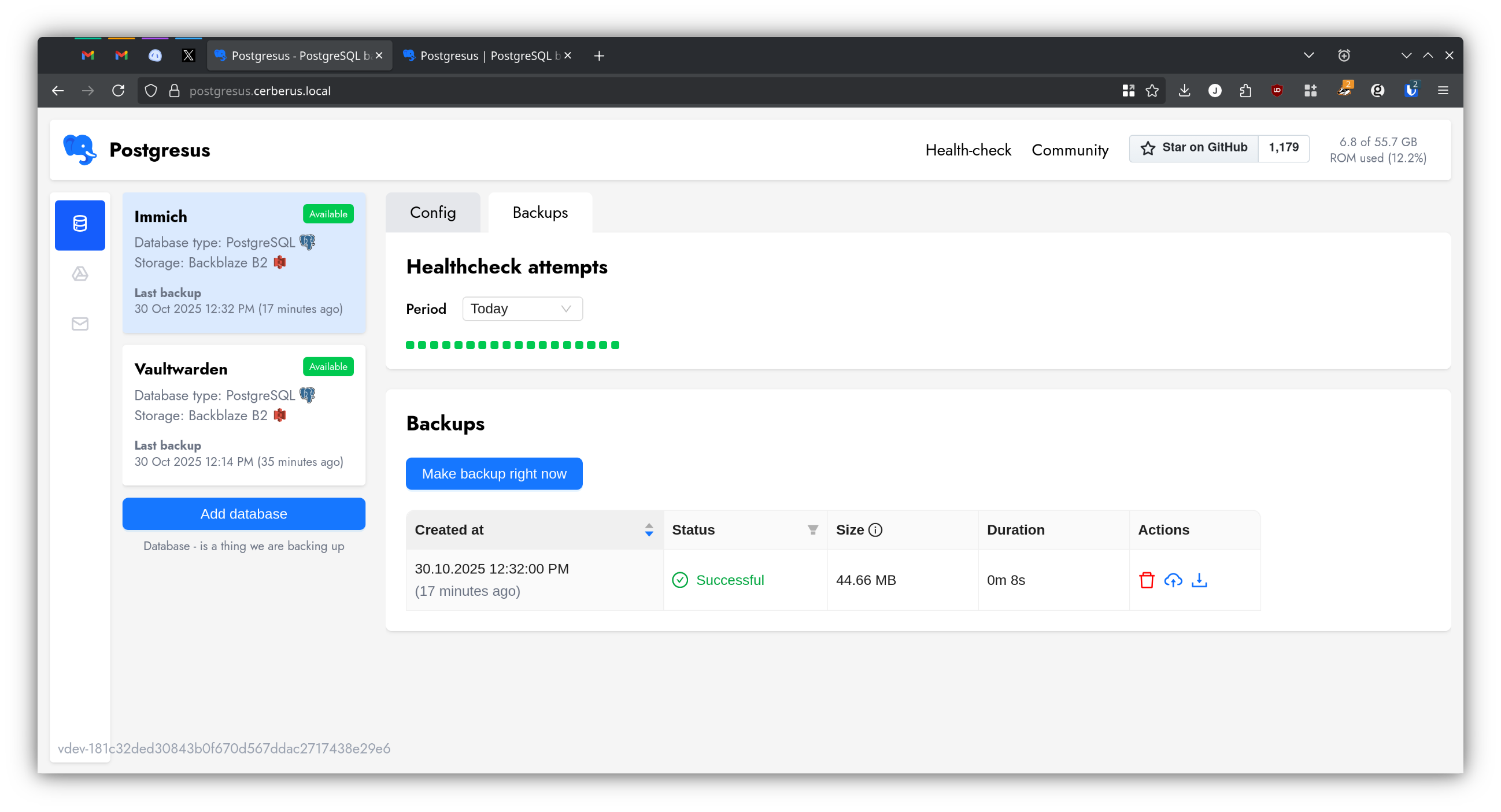 Decided to give Postgresus a go for managing my DB backups and monitoring. Connected Vaultwarden and Immich's DBs to it, have them backing up to Backblaze B2 for offsite backups, and connected email and Discord notifications just in case the DBs eat themselves somehow. The backups work pretty well, gonna see how things go with it.