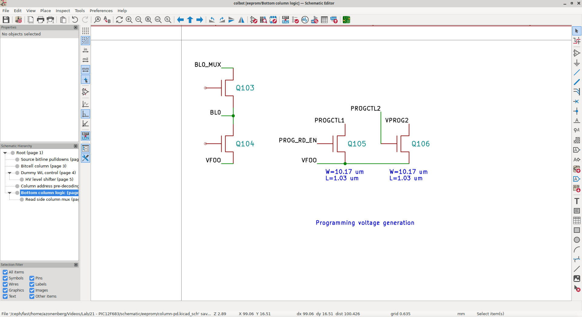 The circuit that I thought was the column mux itself seems straightforward, just eight pass transistors that connect the drain-side bitlines to a common 8-bit bus on metal 2 running the full width of the array.