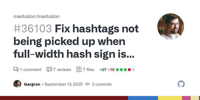 This is probably important for #MastoDev folks: supporting full-width hash and at signs https://github.com/mastodon/mastodon/pull/36103