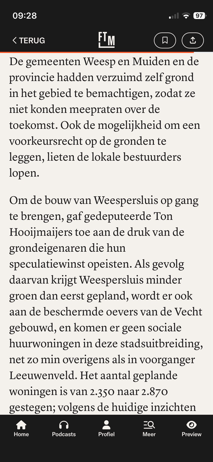 Maar over het karakter van nieuwbouwwijk Weespersluis heeft het eigen stadsbestuur tien jaar geleden al beslist. In 2018 kwam het aan de orde in mijn artikel voor Follow the Money