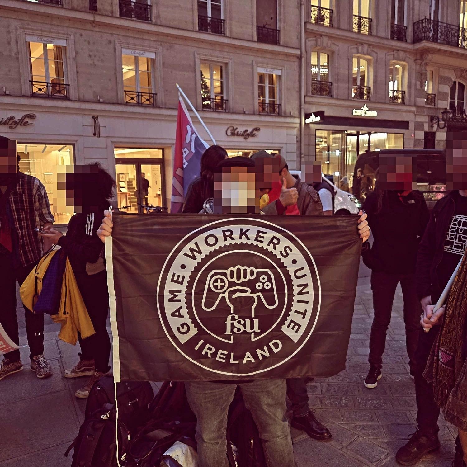 Some of our members in Game Workers Unite Ireland were in Paris for a game union summit today and joined the STJV and other European game worker unions for a solidarity protest outside Take Two offices.