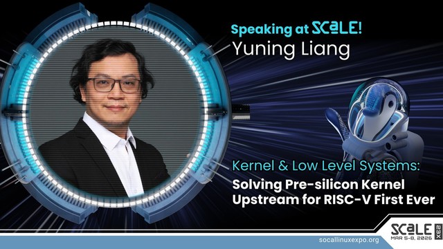 Yuning Liang will speak on 'Solving Pre-silicon Kernel Upstream for RISC-V First Ever' as part of our Kernel & Low Level Systems track at SCaLE 23x. Full details: https://www.socallinuxexpo.org/scale/23x
