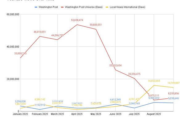 RivalIQ: WaPo's YouTube channel's views fell 85% from April to September, after Dave Jorgenson, who led the channel, left to launch Local News International (Matt Karolian/📰🤖)