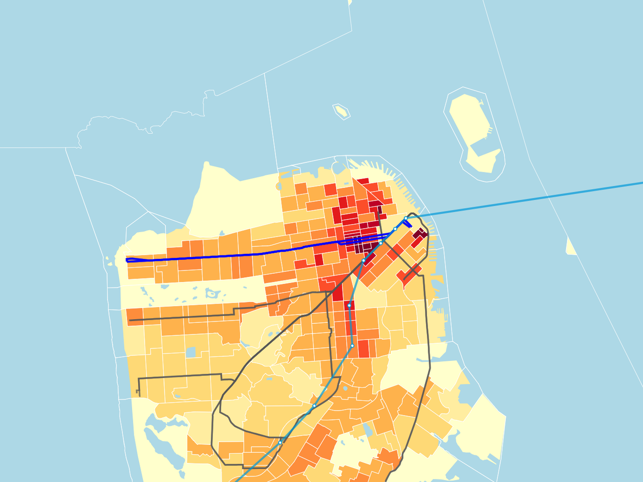 This is a good start but the subway should curve south down 19th Ave, meet up with Daly City BART and continue on the BART tracks down to Millbrae. That part is essential; a branch to Outer Richmond could be added later as a nice-to-have.