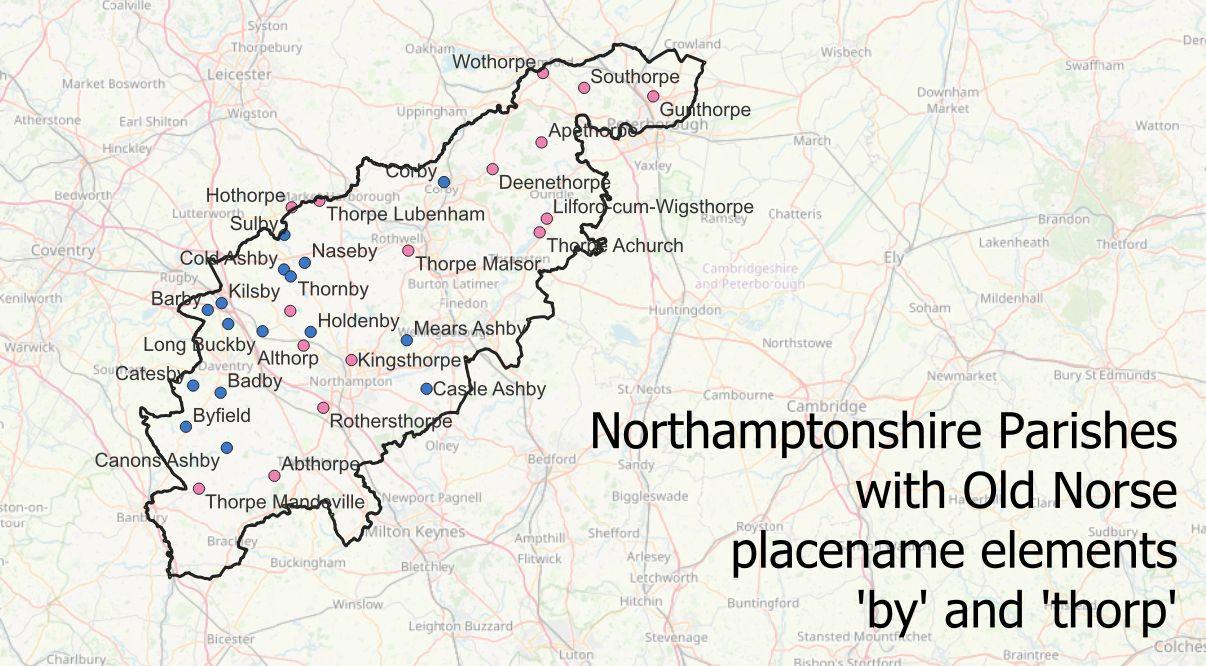#30DayMapChallenge Day 24: Places and their names. Place name elements are always interesting (and fun) to map. Here the Old Norse 'by' and 'thorp' elements in #Norhamptonshire. Data from Digital Survey of English Place-Names