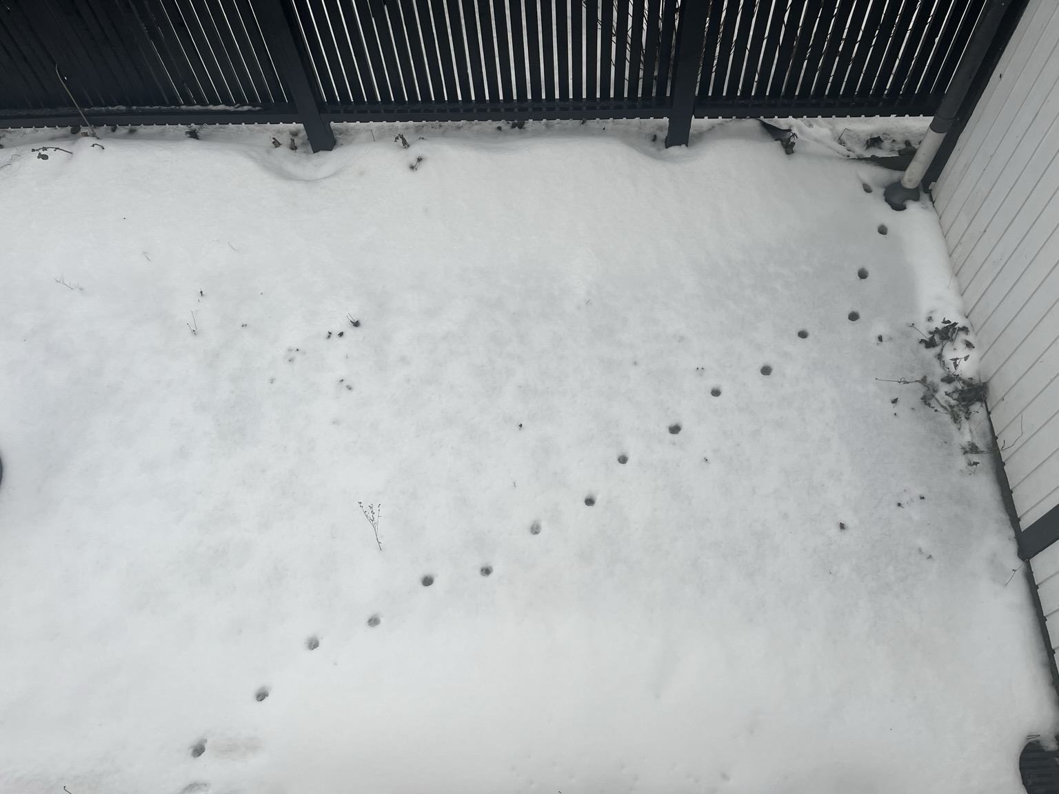 Fodspor i sneen. En af nabolagets katte har været forbi her i lŸbet af natten eller den tidlige morgen, ser det ud til.
