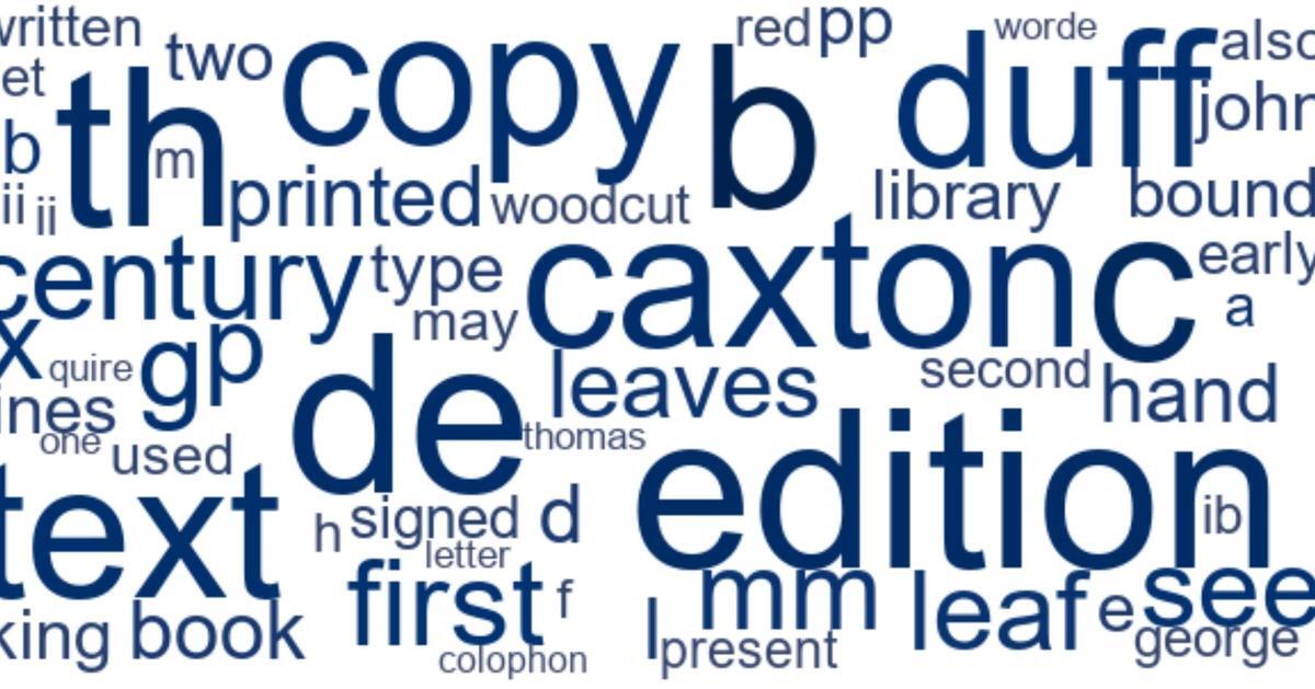 A lovely post from Jeanette Croen, a PhD placement student, on her work at the British Library doing computational analysis on early printed book descriptions https://www.bl.uk/stories/blogs/posts/computational-analysis-of-book-descr…