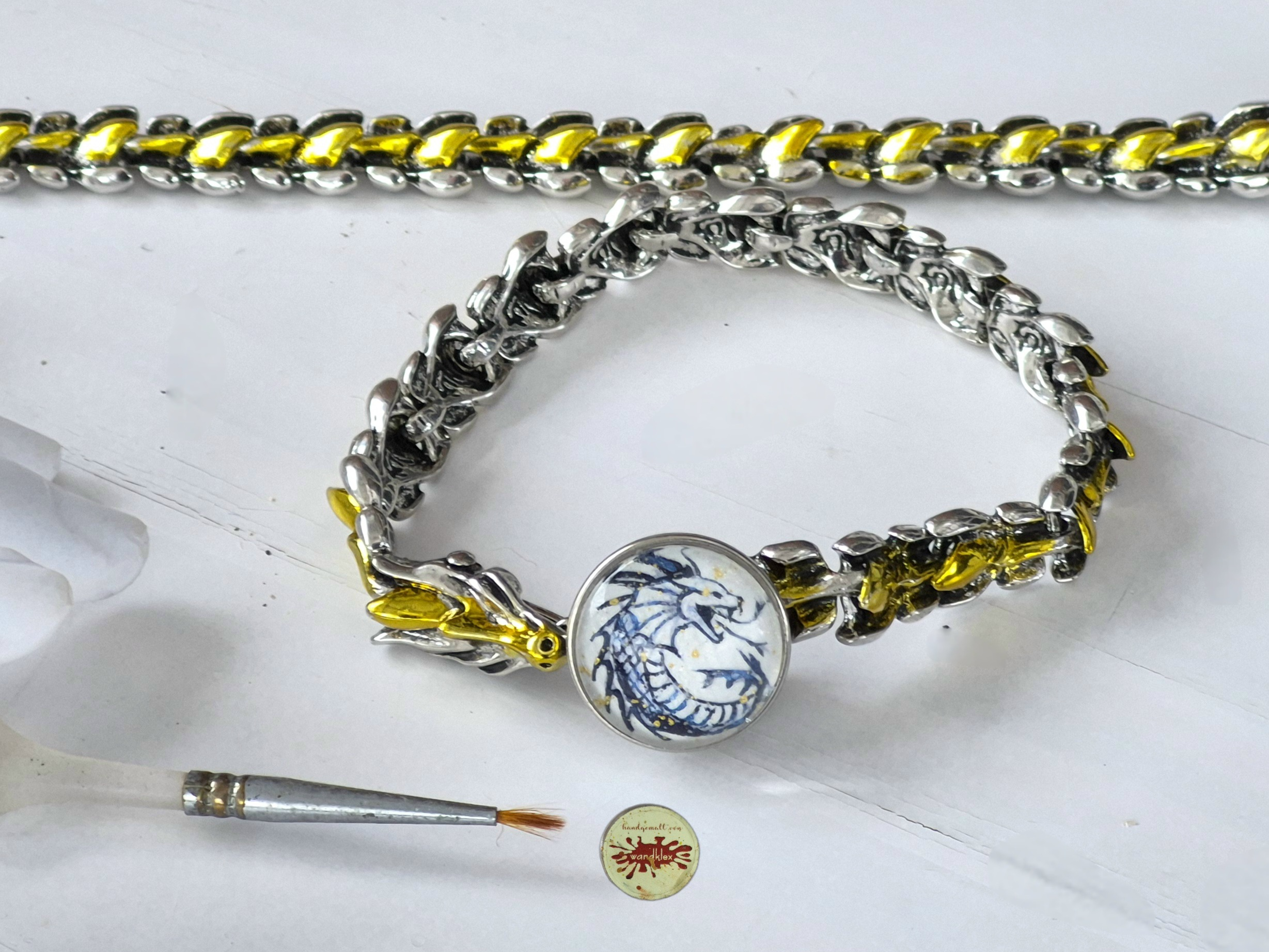 Der große Drache von gestern zog schon weiter, aber ich hab noch Mini-Drachen to go zur Hand: auf 20mm handgemalter #wandklexschmuck auf Drachenschuppen-Armband. (Druckknopfwechselsystem, kompatibel mit allm meinen anderen Druckknopfkunststückchen) auf #miniaturepainting #art #artShop #fediArt #mastoArt #creativeToots #artForSale