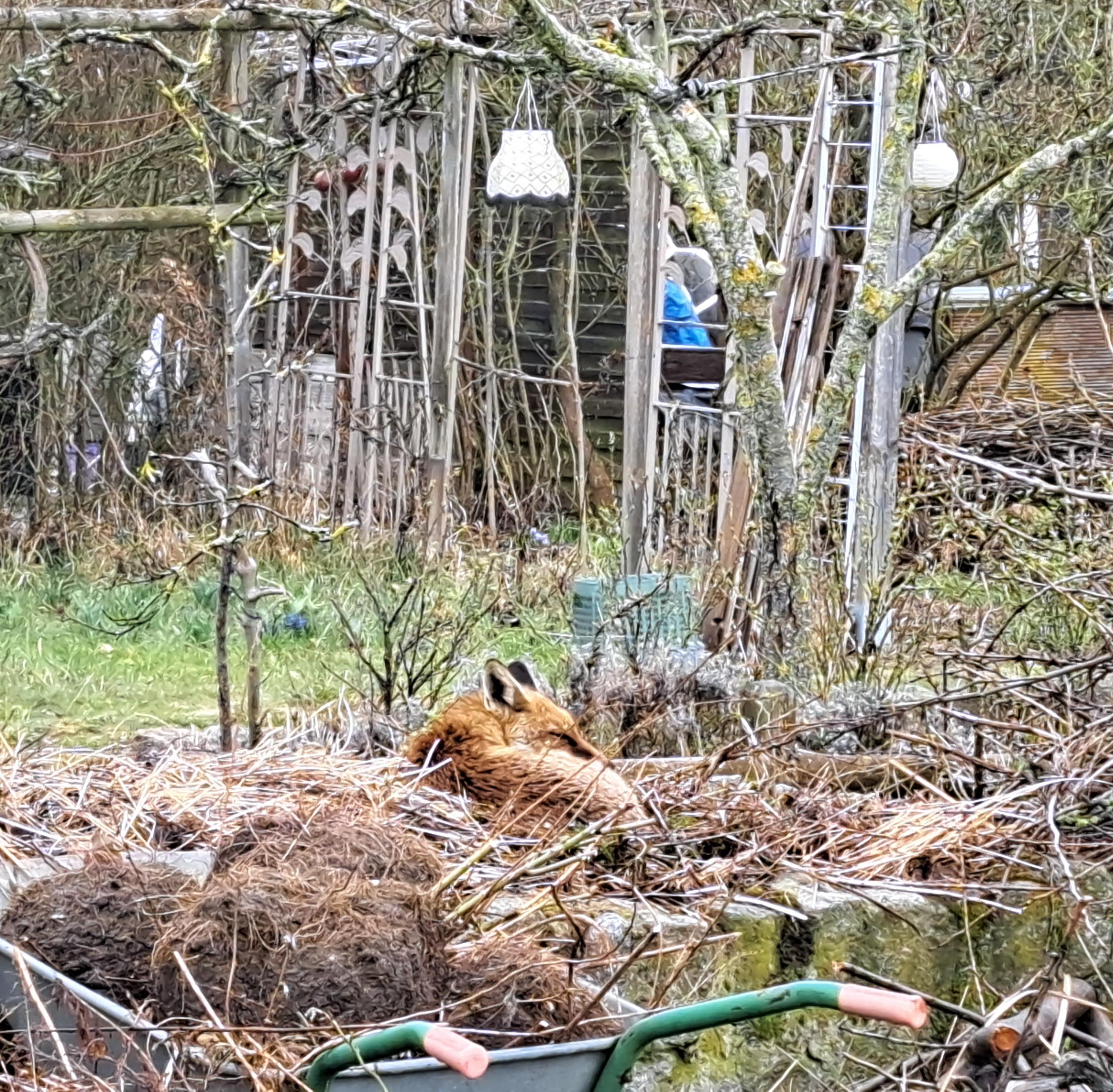 Vermutlich war die Zersetzungs-Wärme vom Komposthaufen genau richtig für diesen gemütlichen Fuchs-Mittagsschlaf an einem nebel-kalten Berlin Vormittag 🦊
