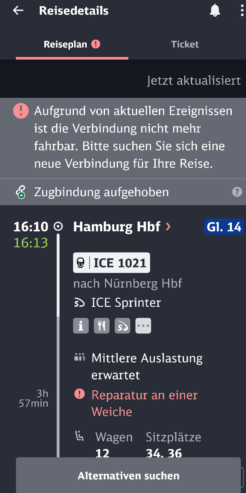 Allerdings gibt es zwischen Hannover und Hamburg laut Bahn App im Moment eine Oberleitungsstörung.
