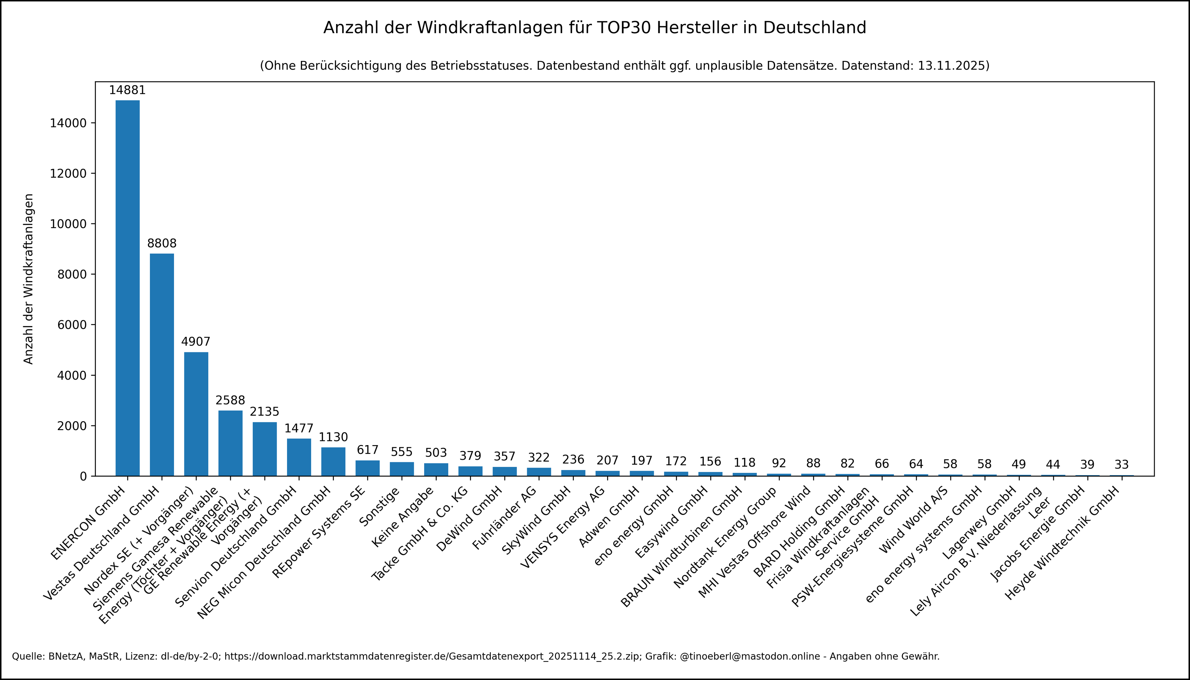 Anzahl der #Windkraftanlagen je Hersteller in #Deutschland mit Stand vom 13.11.2025.