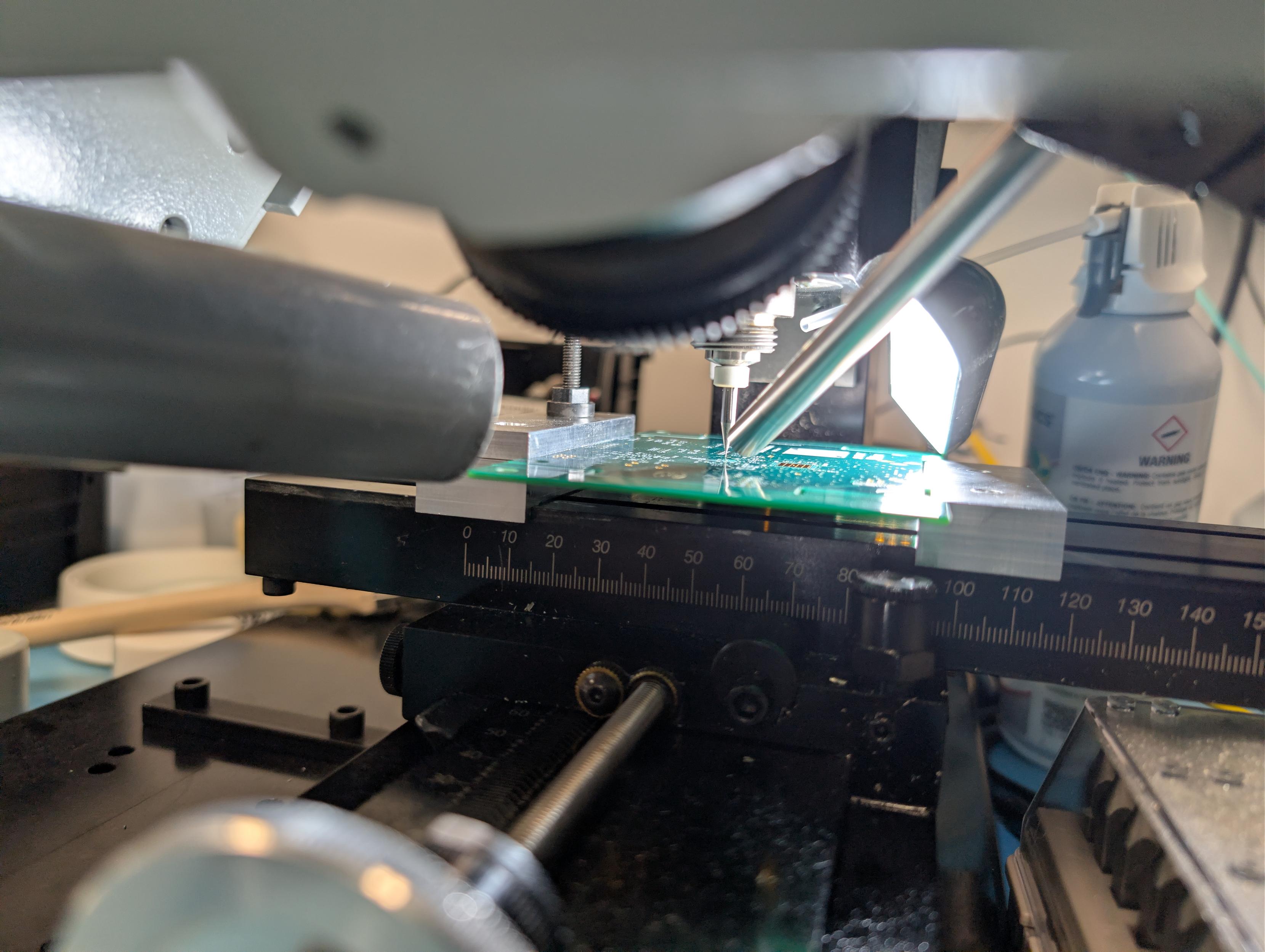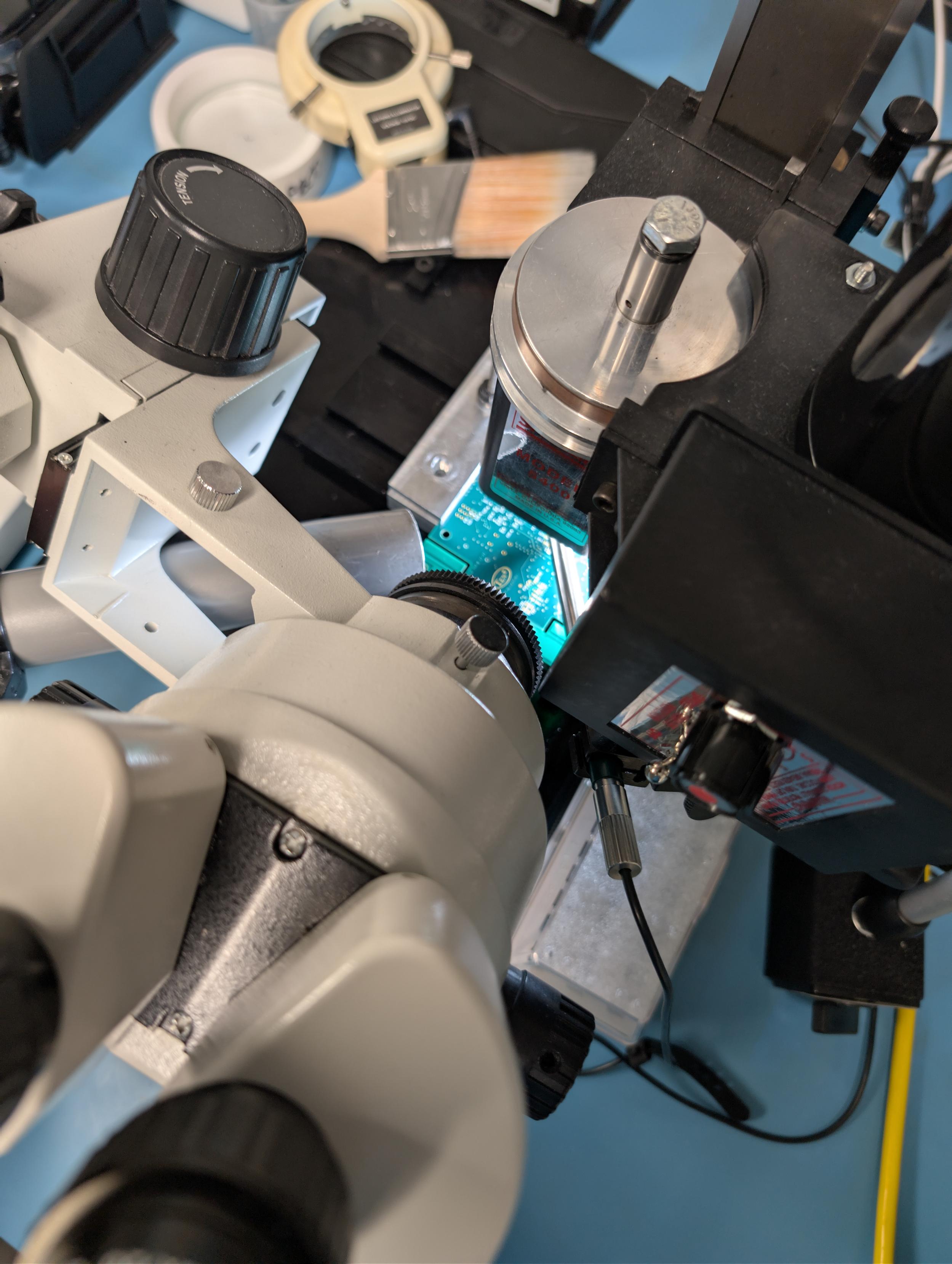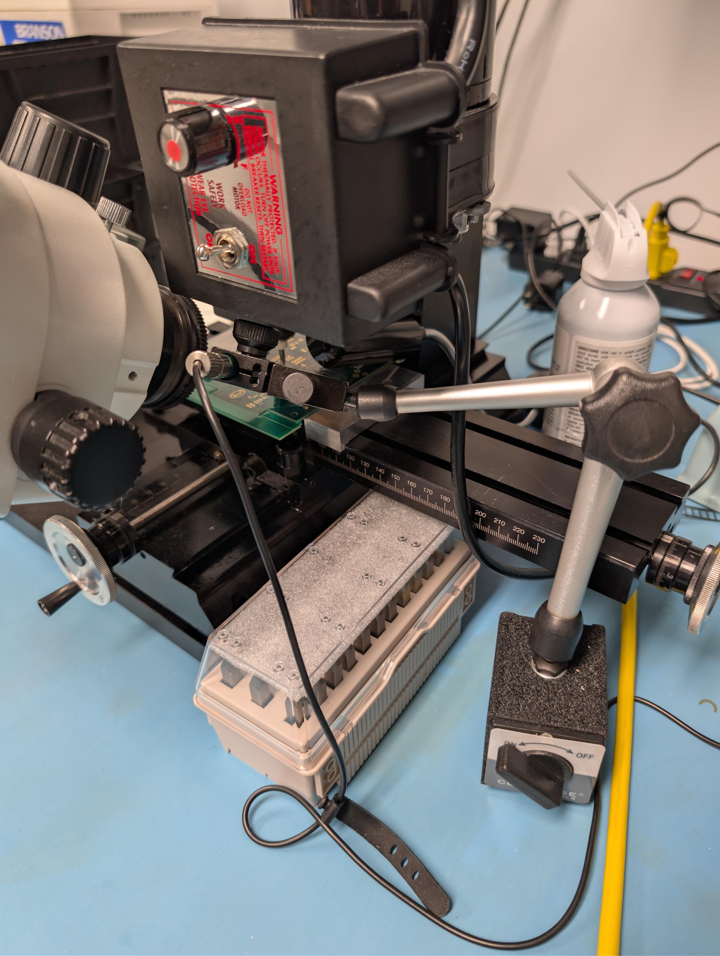 The setup is definitely getting as cramped as a FIB chamber with the spindle, camera, optical scope, light, compressed gas spray, and suction all vying for space around the workpiece