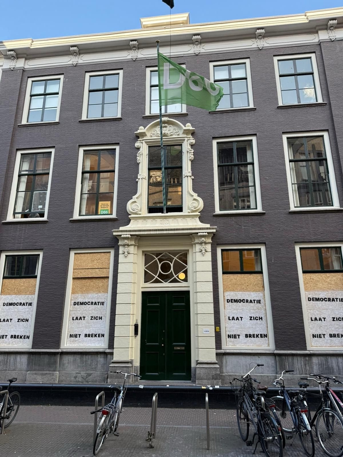Mooi beeld door de ingegooide ruiten van het D66 partijkantoor.
