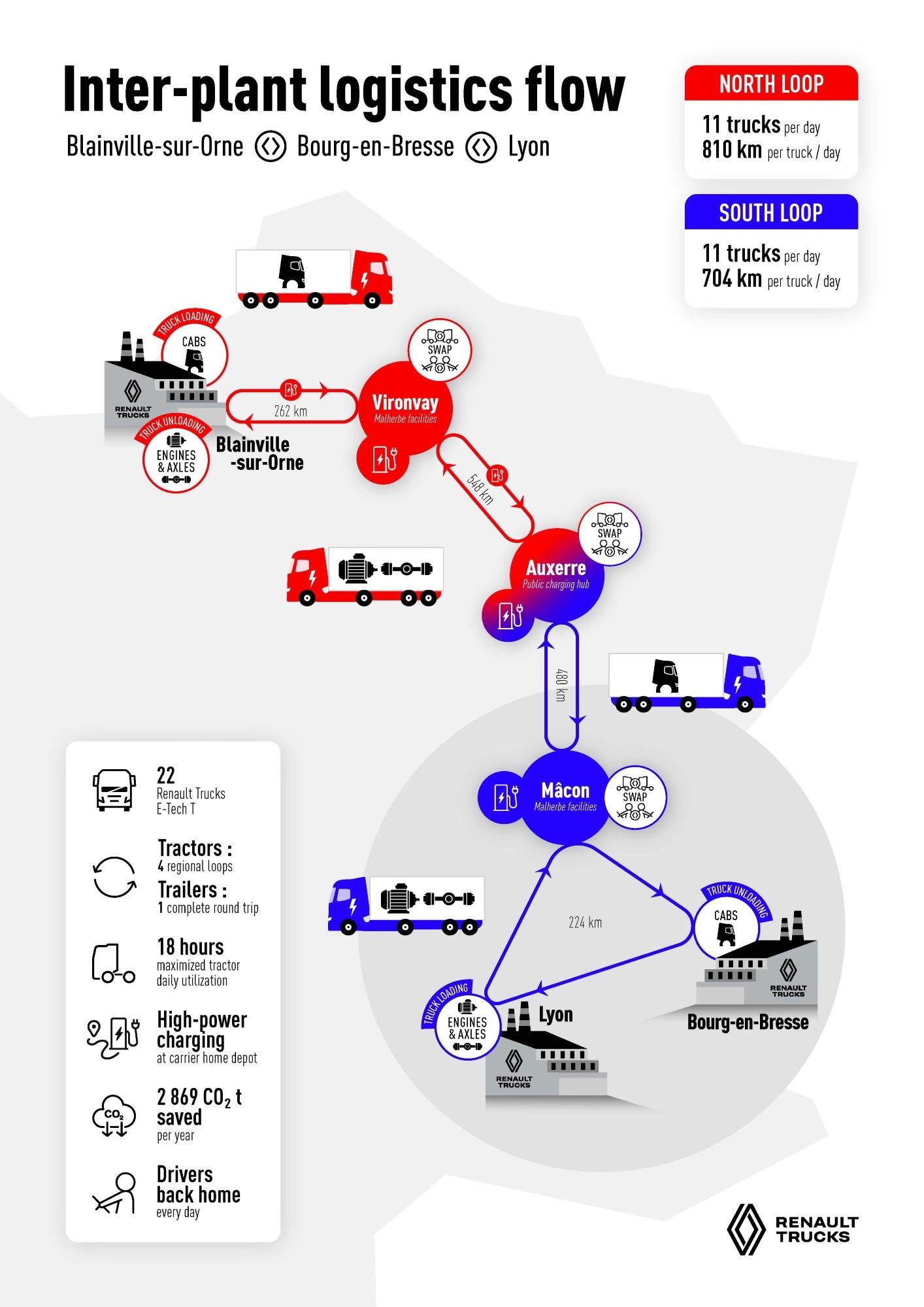 "Thanks to a series of relay stops (to swap electric tractors, drivers and trailers), each electric truck travels a daily distance of 810 km on the North loop and 704 km on the South loop. This system makes it possible to cover long distances without stopping the load."