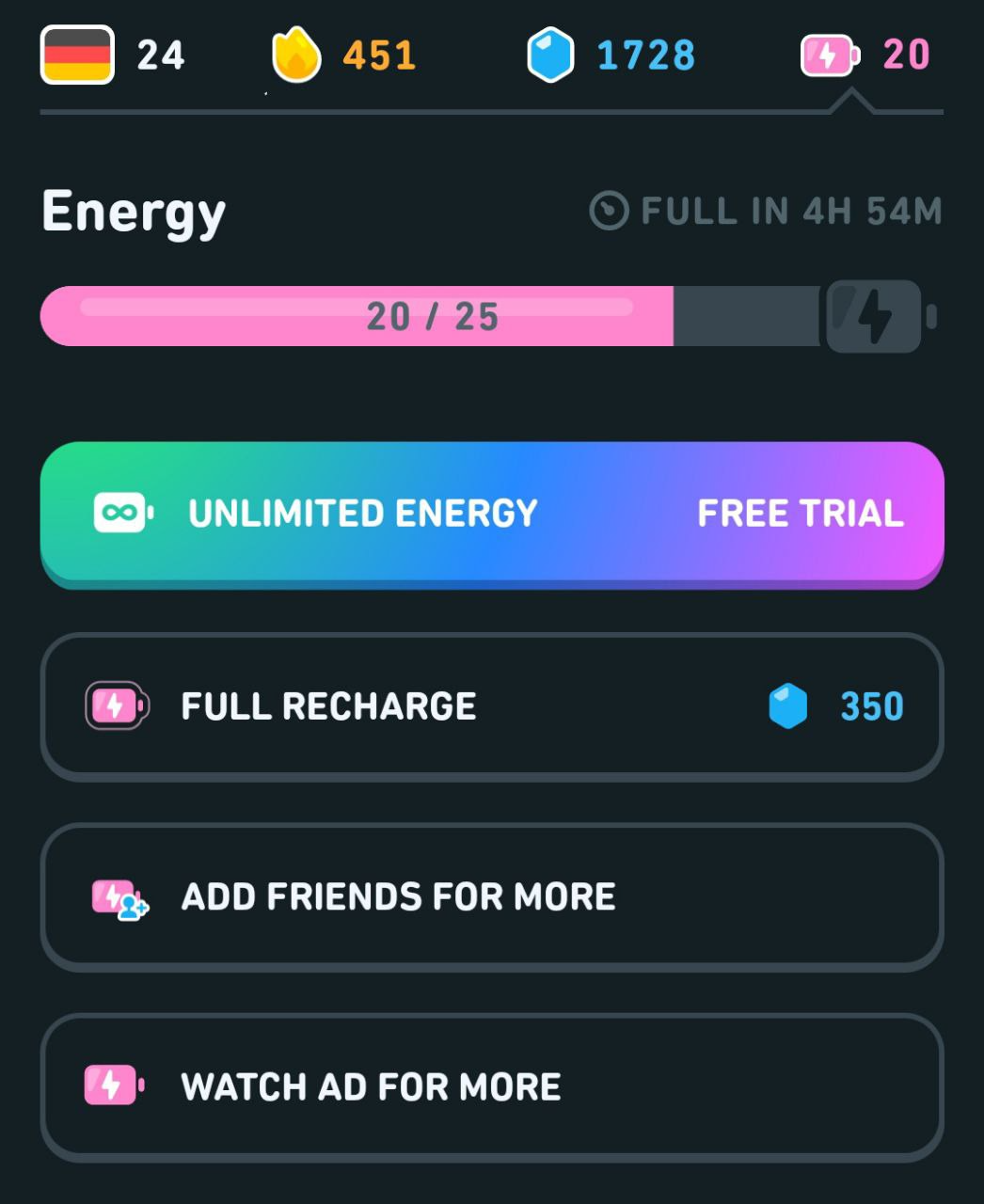 Мне очень жаль терять мой стрик в Duolingo... Но введение энергии, которая тратится на каждое выполненное задание в уроке, вместо сердец, которые тратятся только когда ты ошибся — это прямо красная линия для меня. За безошибочный урок я получил -5 энергии.