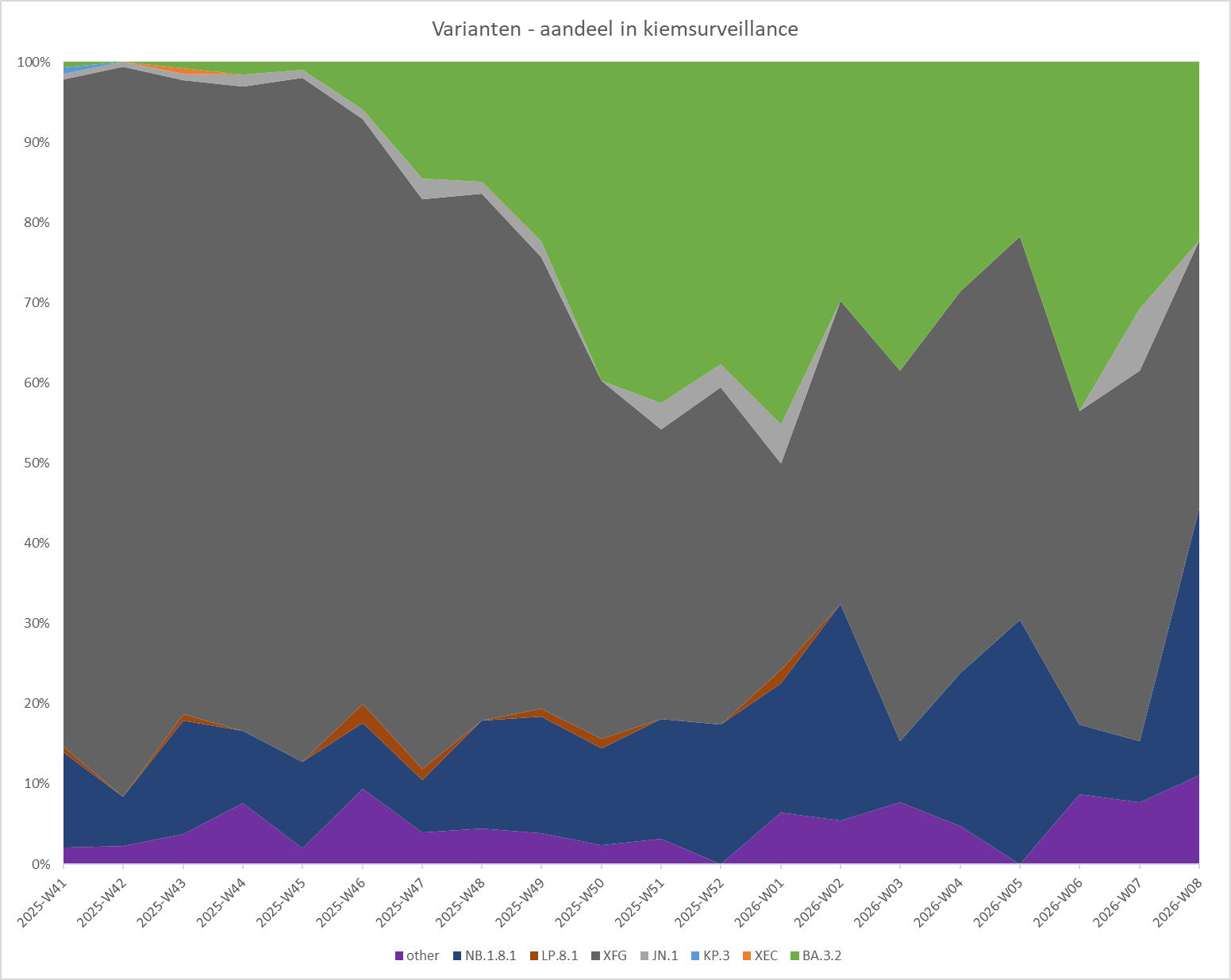 Zowel BA3.2 als XFG lijken nu wat op hun retour, maar kunnen elkaar i.i.g. niet weg drukken. NB1.8.1 lijkt juist weer wat op te komen. Disclaimer: de laatste week, waarin dat gebeurt, betreft nog maar 9 samples.