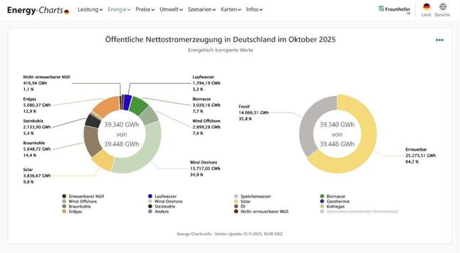 Im Oktober 2025 stammten 64,2 Prozent der öffentlichen #Nettostromerzeugung in #Deutschland aus #ErneuerbareEnergien.