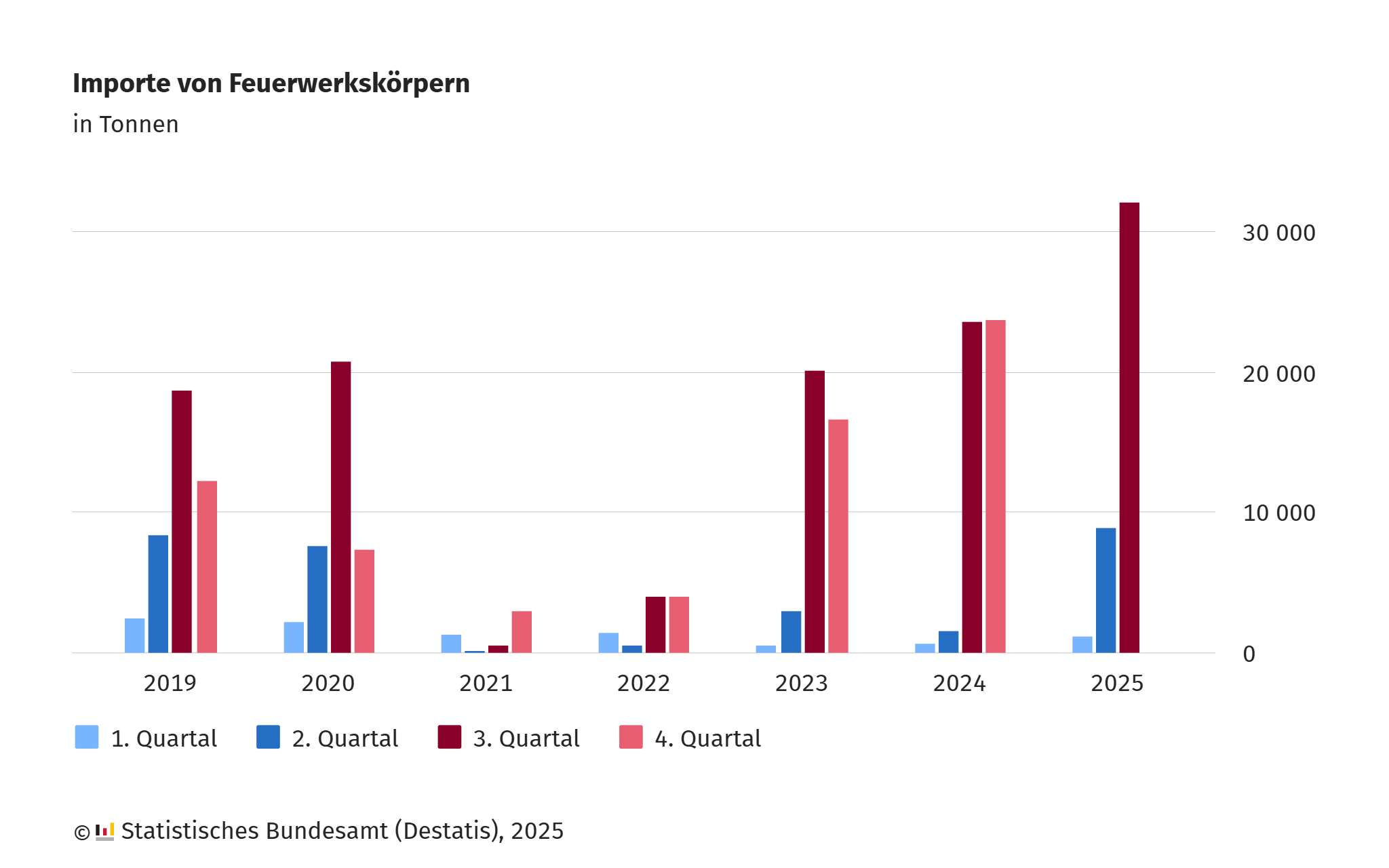 In diesem Jahr wurde so viel #Feuerwerk importiert, wie lange nicht: Von Januar bis September 2025 2/3 mehr Feuerwerkskörper als im Vorjahreszeitraum. Auch die Menge aus dem Vor-Corona-Jahr 2019 wurde übertroffen, fast alles aus China.