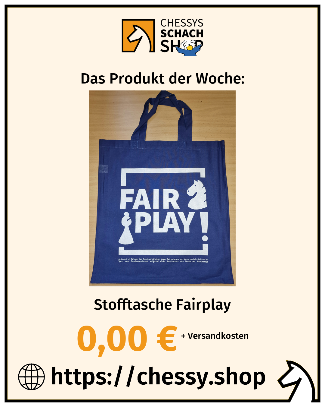 Fairplay nicht nur am Schachbrett zeigen, sondern auch beim Einkaufen? Kein Problem mit unserer kostenloses Fairplay-Tasche – aber nur eine Tasche pro Bestellung.
