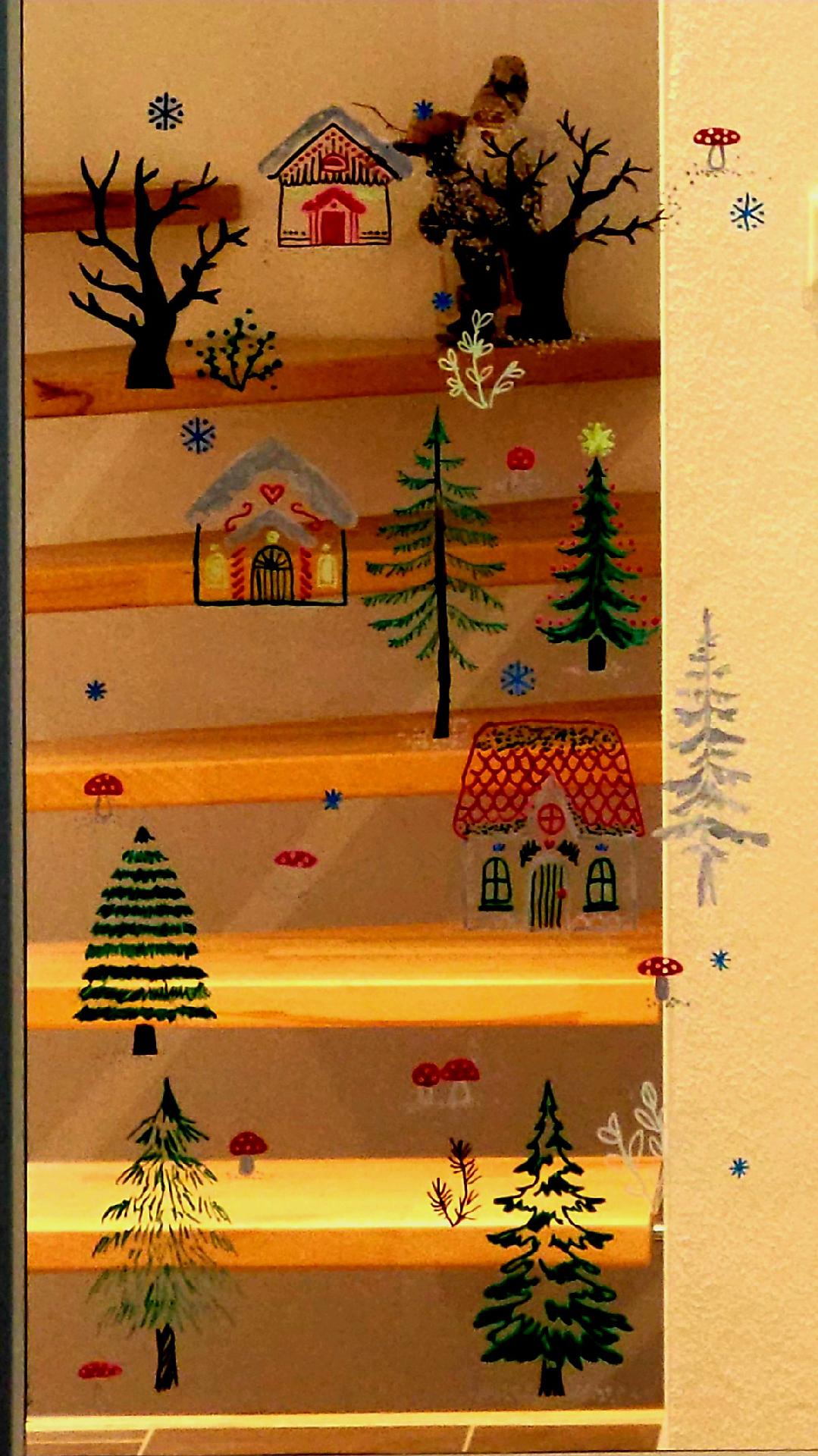 A 10-year old's winter painting on an interior glass door (at a friend's). The objects are traced using a "FensterBilder" and really well executed.
