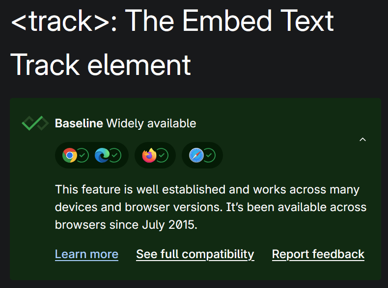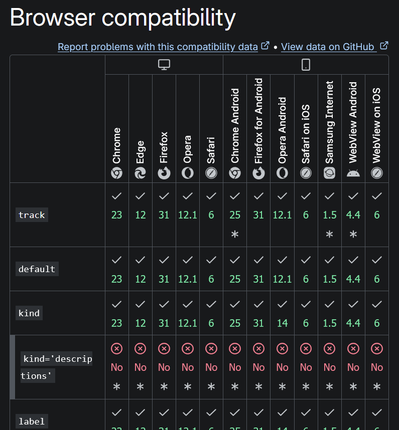 Just me trying to reconcile Baseline listing `<track>` as “widely available” and all browsers shown with green checks when down the page there’s an entire row of red Xes for one of the core accessibility features of `<track>`.