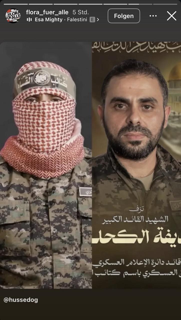 Der jetzt bestätigte Tod Hudhaifa al-Kahlouts, dem Sprecher der al-Qassam Brigaden, ist vermutlich schwer zu verkraften für Flora für Alle. (Der per Story geteilte Post stammt von Hüseyin Dogru, dem Gründer von RedMedia.)