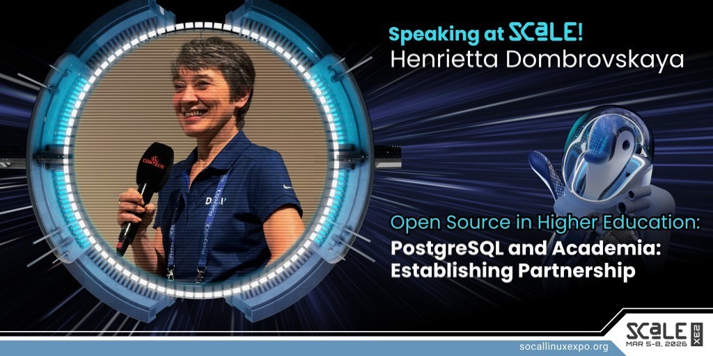 Henrietta Dombrovskaya will speak on 'PostgreSQL and Academia: Establishing Partnership' as part of our Open Source in Higher Education track at SCaLE 23x. Full details: https://www.socallinuxexpo.org/scale/23x