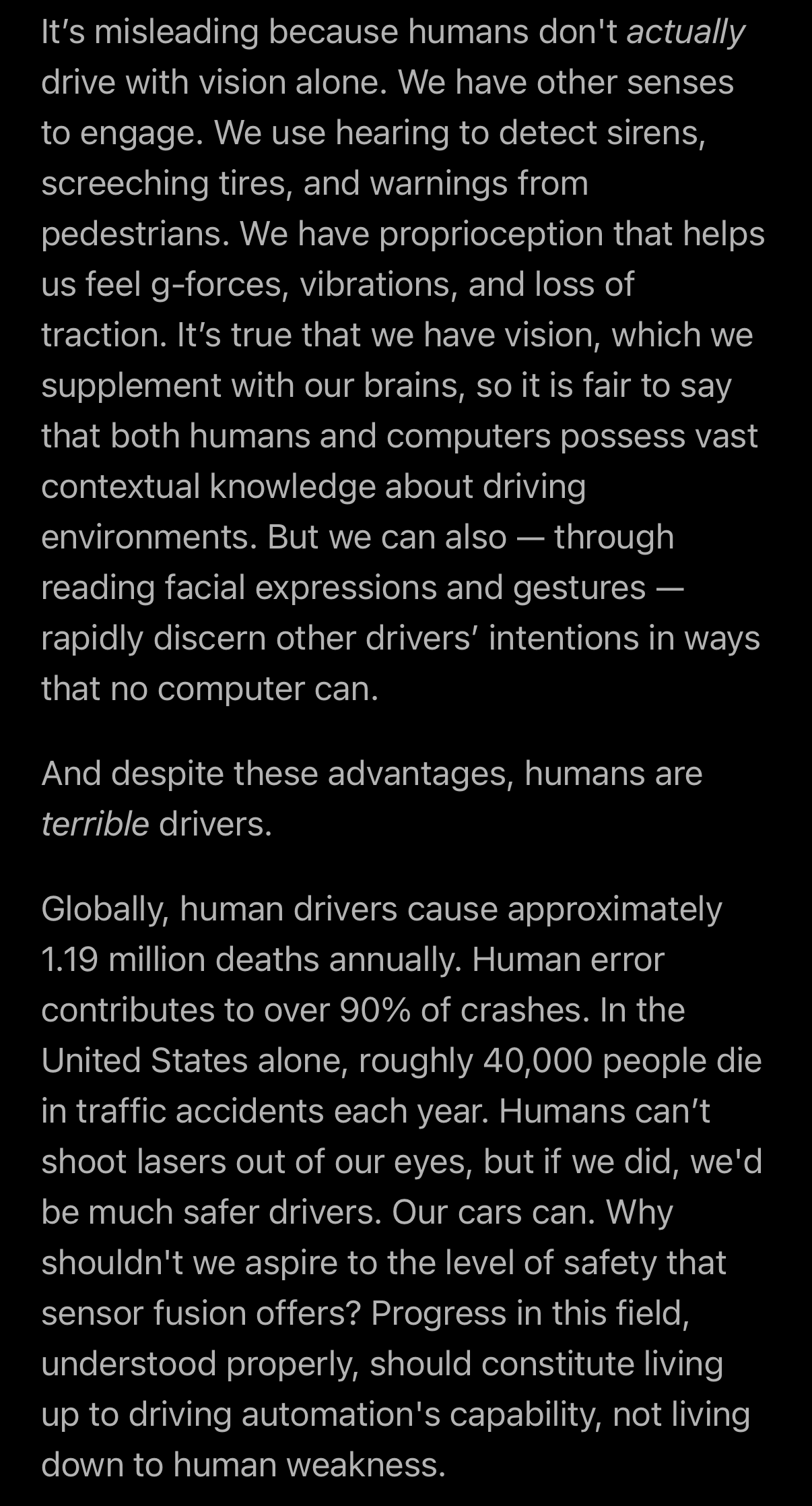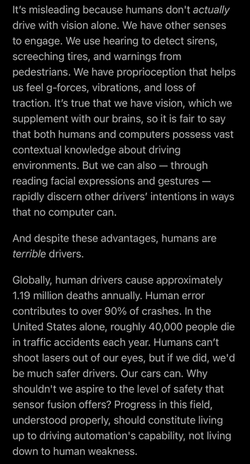 Great take on the „humans drive with vision alone, so why shouldn’t cars“ argument made by #Tesla.